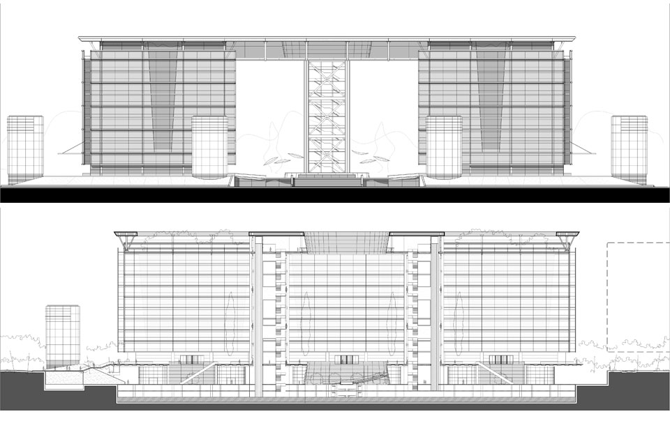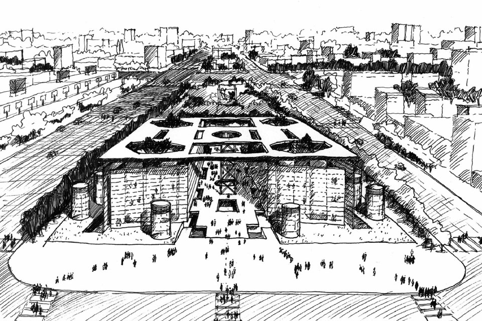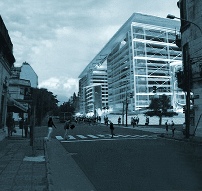 Construir un paisaje colonizador en este sector desestructurado de la ciudad. Las terrazas mirador y la quinta fachada están estructuradas con la gran cubierta que aloja los Ministerios Públicos que articulan todos los fueros. El enorme techo cobija al público.