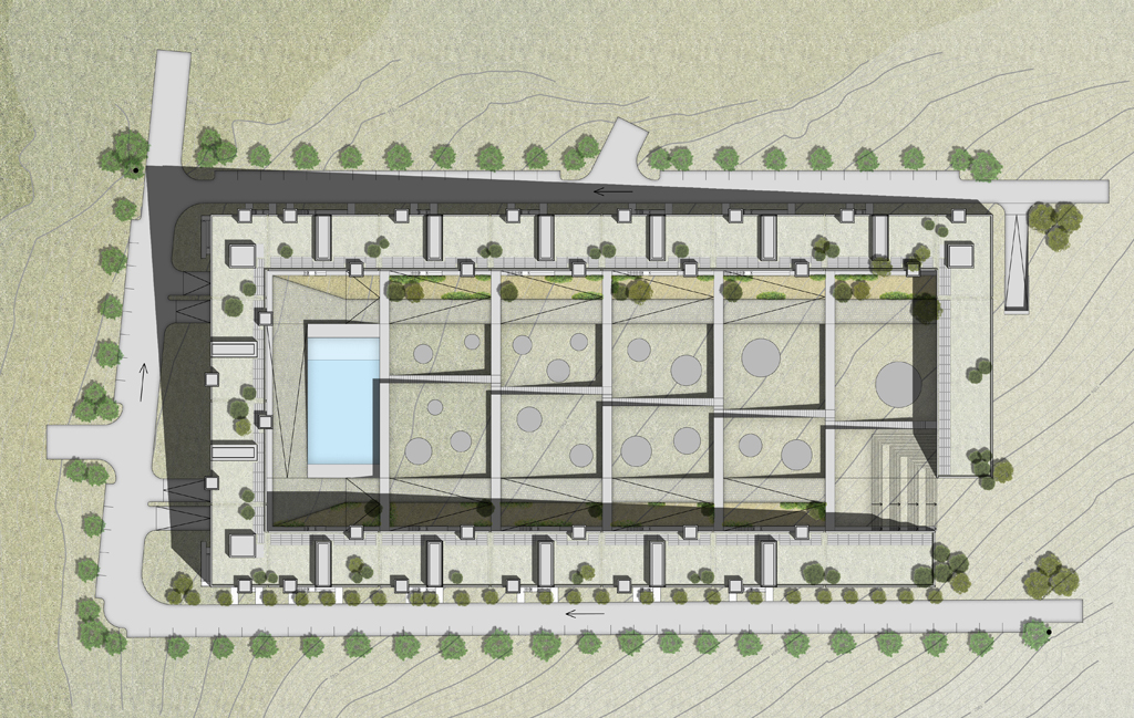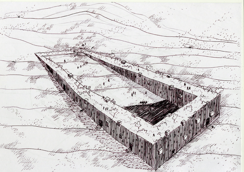 El espíritu de la propuesta fue concebir una operación donde lo construido se define como un anillo que contiene un fragmento de territorio estepario de pronunciada pendiente. A manera de objeto extraño, que se opone al paisaje natural, un trazo en el paisaje como signo artificial de la cultura.