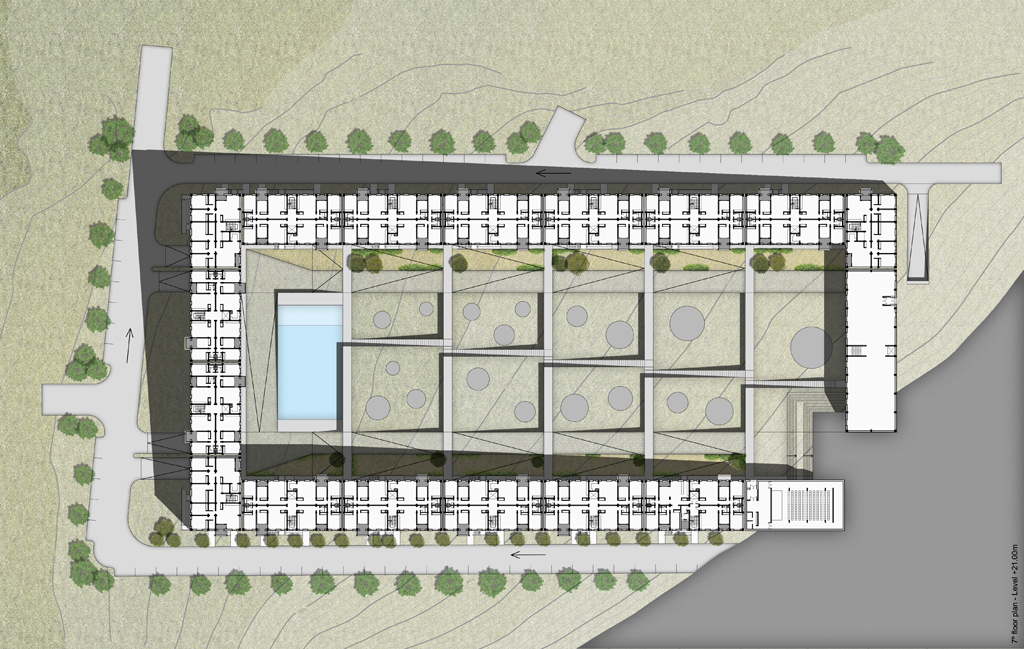 Las viviendas, oficinas y locales comerciales, se alojan en el anillo perimetral. En el área interior se encuentra un gran vacío, a manera de plaza de encuentros, que se escalona acompañando la fuerte pendiente del lugar y se continúa con la montaña. Desde ella una escalinata en zig zag acompañada con una acequia recorre todo este vacío para culminar en el punto más bajo, en un estanque de agua que en invierno se convierte en una pista de patinaje. Bajo la plaza escalonada, se encuentran las áreas de encuentro colectivo como salas de estar, ámbitos de reunión, biblioteca, cafés, kindergarten, cine, locales de proveedurías, gimnasio y una piscina cubierta. Solo se destacan rajas de cristal que asoman entre la nieve, en los cortes del terreno. También los estacionamientos se encuentran bajo la plaza.