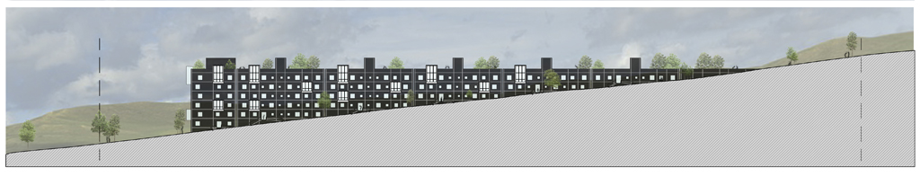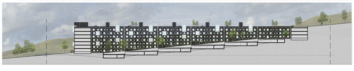 Este cuerpo culmina en un único nivel superior, a manera de cubierta-jardín y se recorta en su base adaptándose a la topografía del lugar. El conjunto se cierra a los fríos vientos del norte y se abre a las montañas hacia el sur. El salvaje paisaje montañoso se derrama en el interior del conjunto y es enmarcado por las potentes masas de hormigón negro. La cubierta del anillo es recorrible en todo su perímetro, desde el pie de la montaña donde lo construido desaparece en el extremo sur oeste, hasta el extremo norte, a 20 metros de altura, con vistas al paisaje de la ciudad.