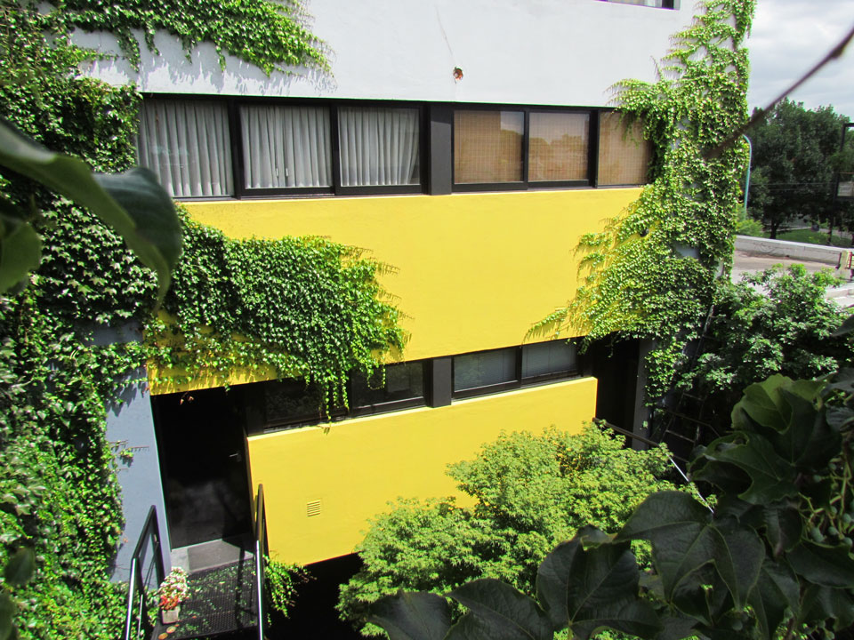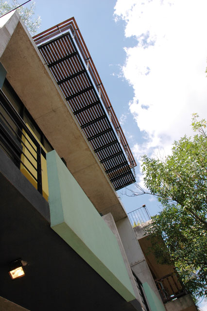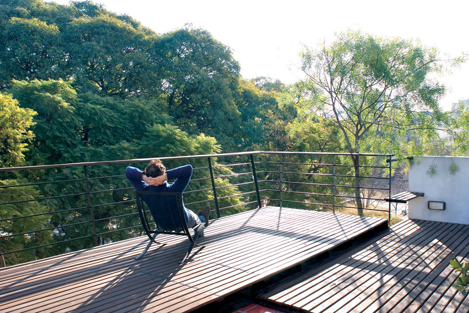 Se generan expansiones en las cubiertas con un amplio deck de madera en voladizo hacia la plaza como cubierta-mirador elevado, allí se alojan un estanque de agua y un aguaribay por cada vivienda, así como una pérgola con santa ritas para generar un espacio de sombras y color. Esta cubierta plena de vida y naturaleza domesticada se articula con la otra naturaleza, la de la plaza, de una importantísima masa arbórea compuesta por añejas tipas y jacarandás que despliegan todo su colorido al florecer con el paso de las diferentes estaciones.