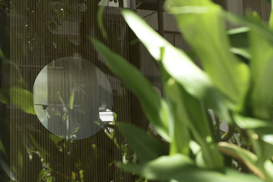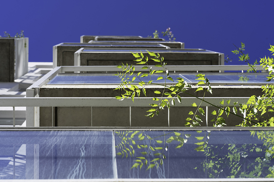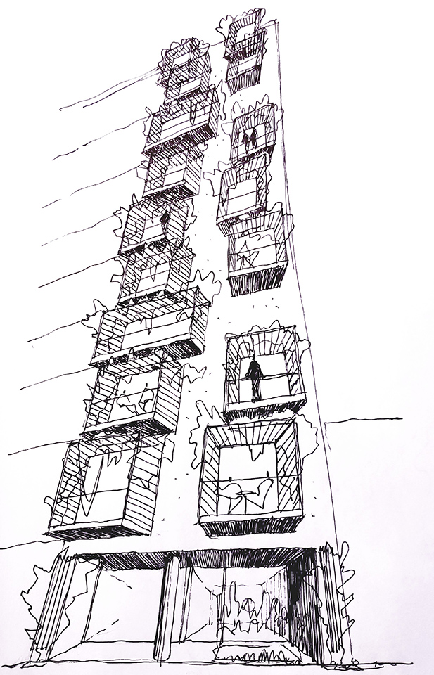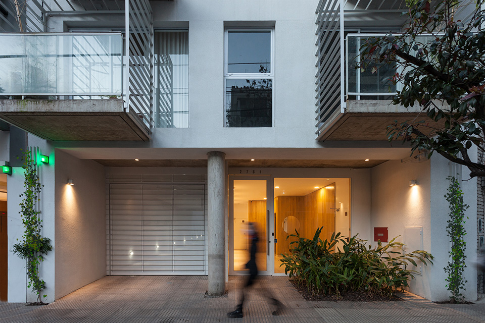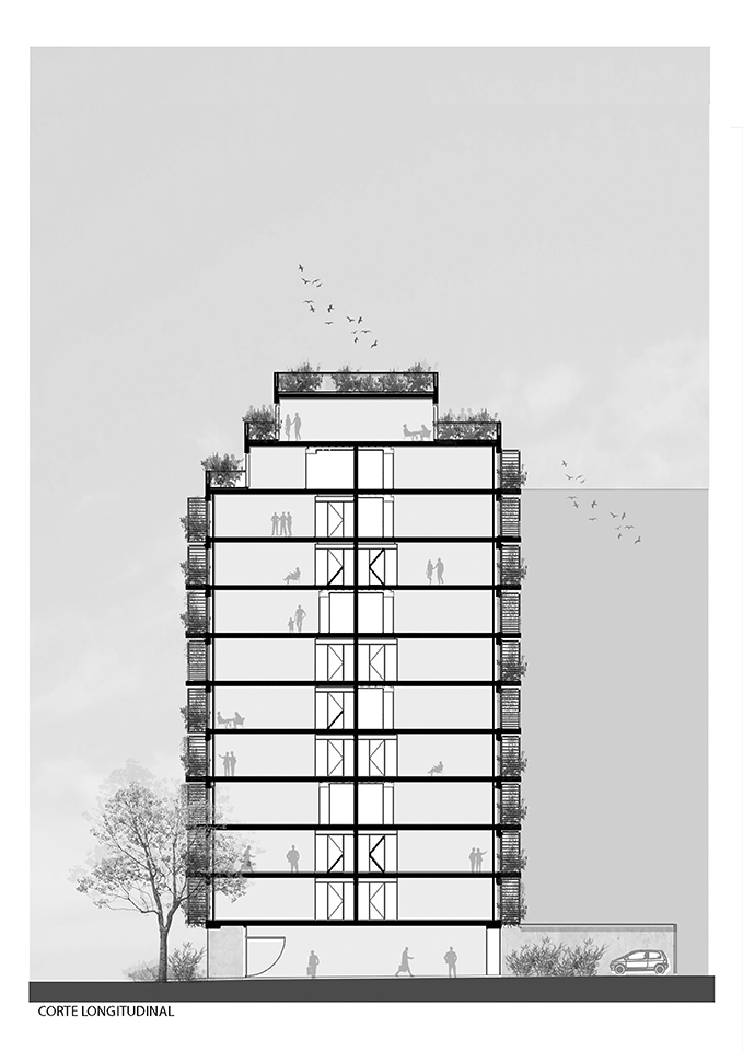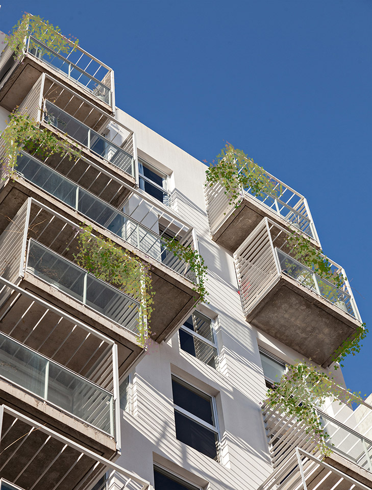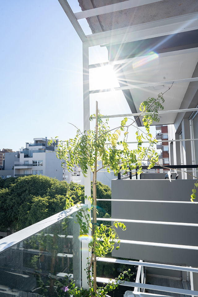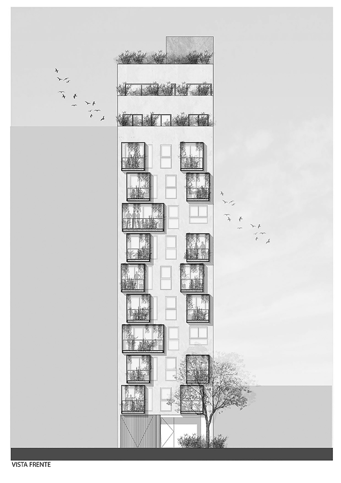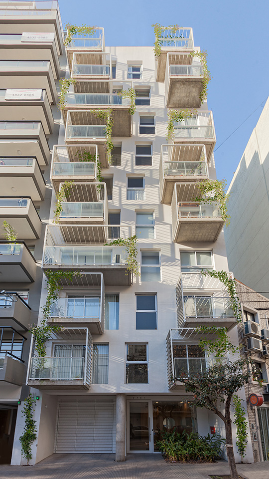 Se proyectó una fachada con expansiones que recuerdan los “balcones limeños” dispuestos a partir de una composición dinámica. Estos espacios están provistos con una estructura metálica a manera de pérgola donde van trepando las enredaderas. Todo el edificio es blanco, muros, carpinterías, herrerías y solados. La continuidad blanca es el telón de fondo del componente vegetal, que irrumpe con su color y movimiento. Lo cartesiano de lo construido y lo imprevisible del componente orgánico, generan un equilibrio entre lo artificial y lo natural. De esta forma se realiza un aporte para reinventar el paisaje urbano.