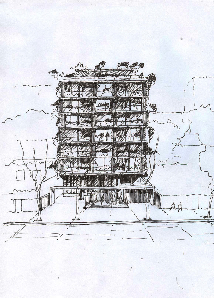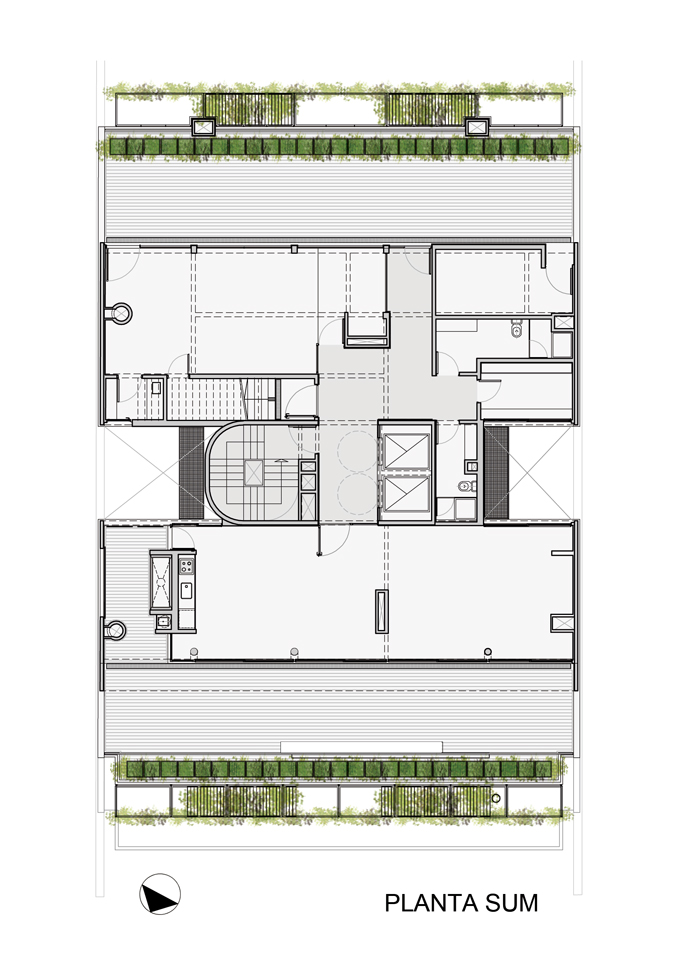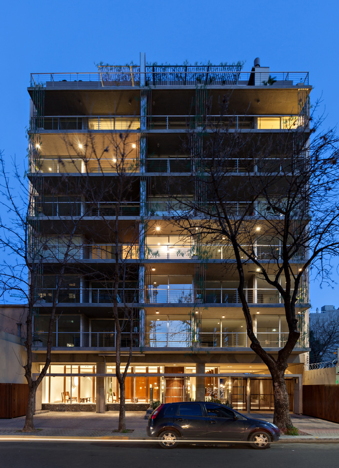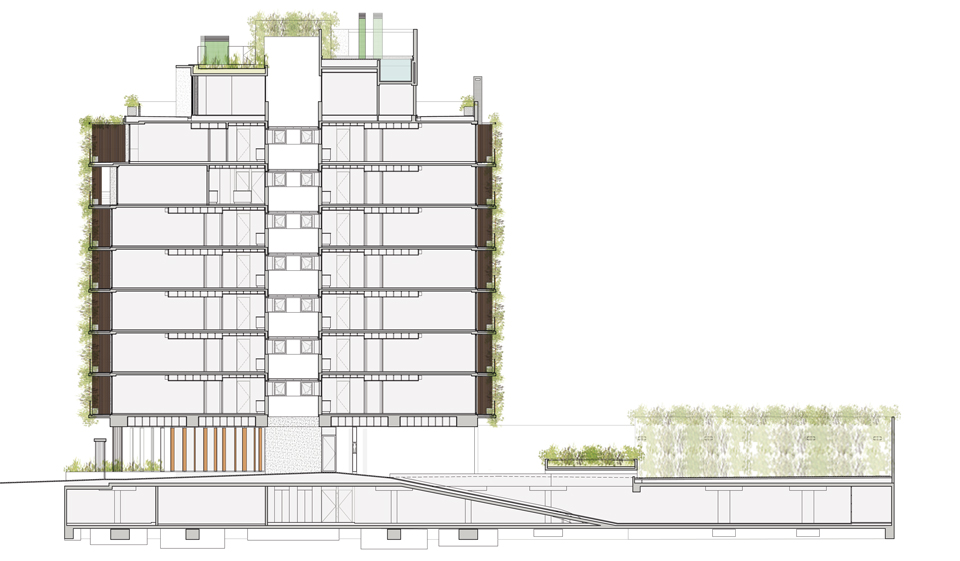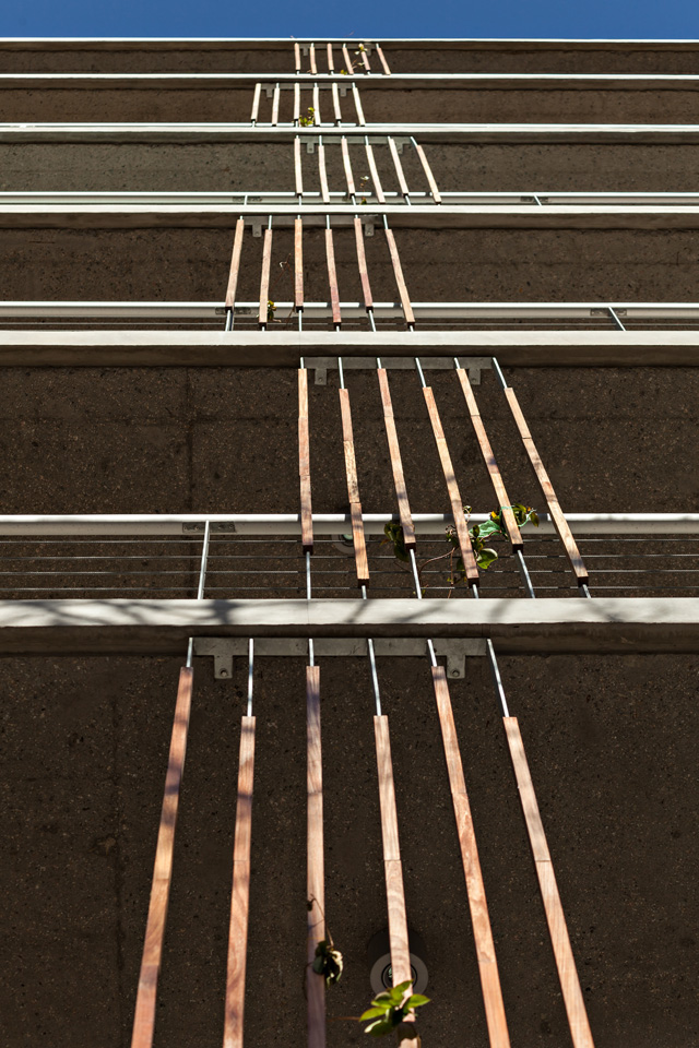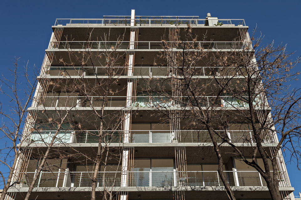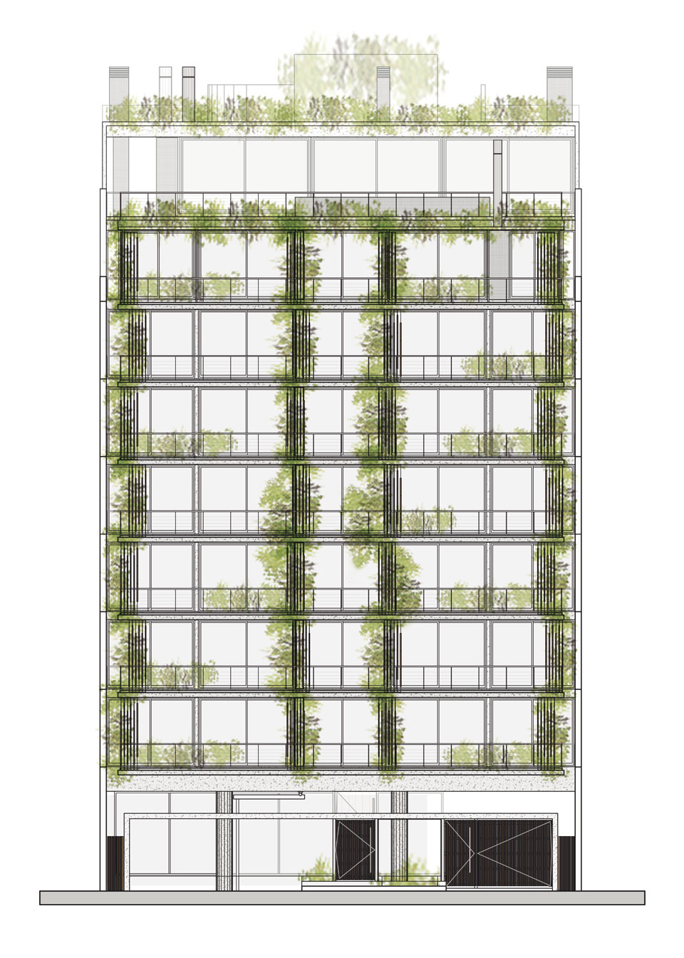 Las siete plantas de viviendas combinan unidades de 2 dormitorios con y sin dependencias. En las expansiones, un conjunto de parasoles verticales materializados con delgadas lamas de madera y las barandas con tensores de acero conforman una membrada cultivada con enredaderas trepadoras, que con el tiempo, cubrirán parte de las fachadas. Este tamiz a la vez de proteger al edificio de la incidencia solar directa, genera un jardín vertical que enriquece las expansiones y las convierten en espacios de transición entre el exterior y el interior de las viviendas. Así el edificio queda atrapado entre dos naturalezas.
