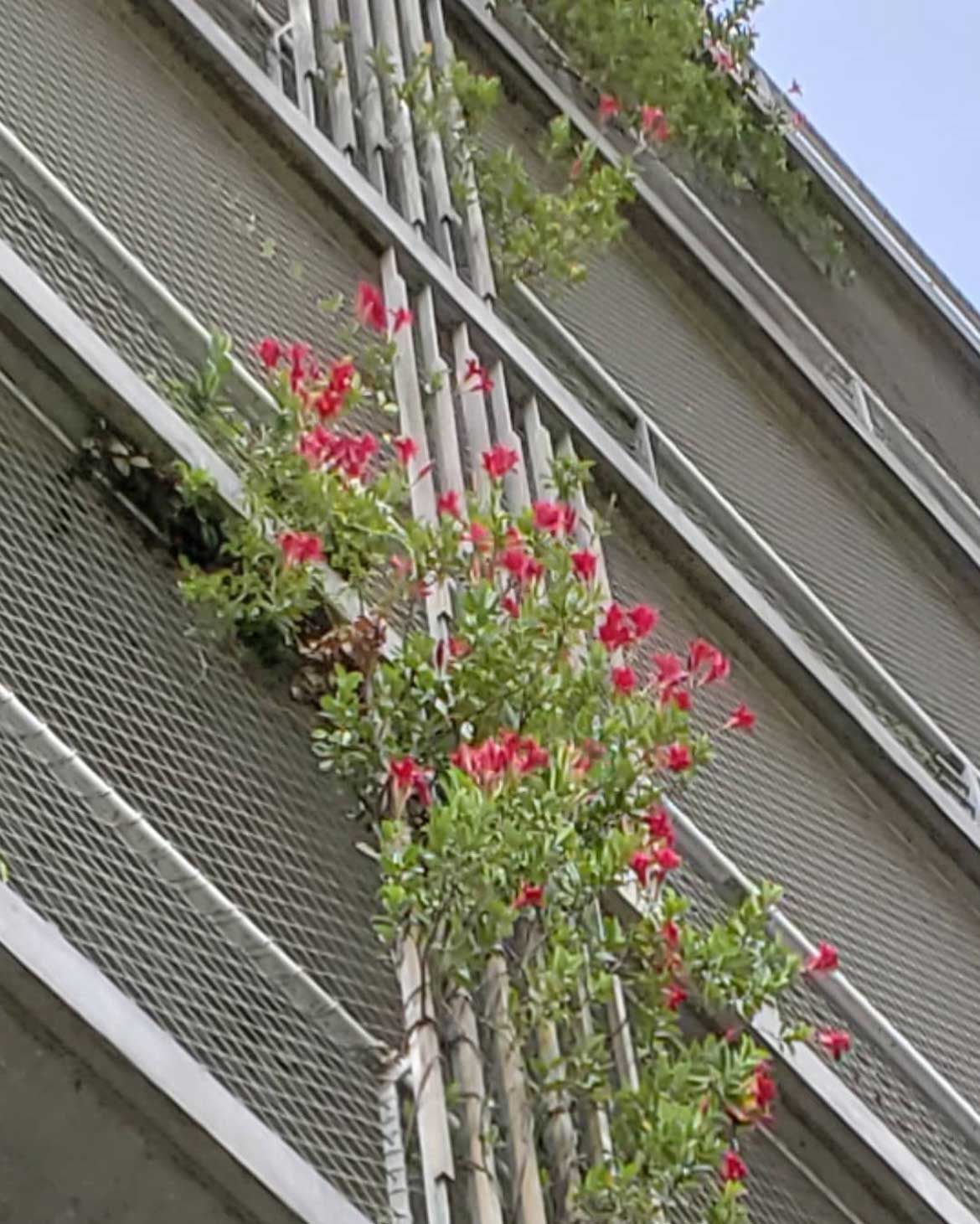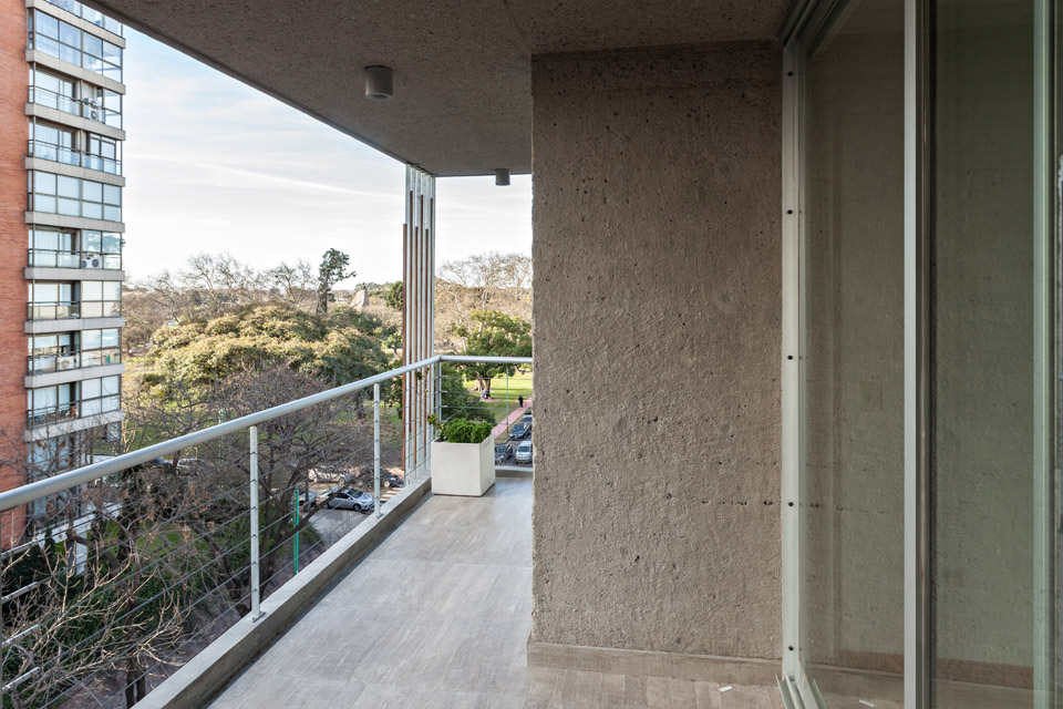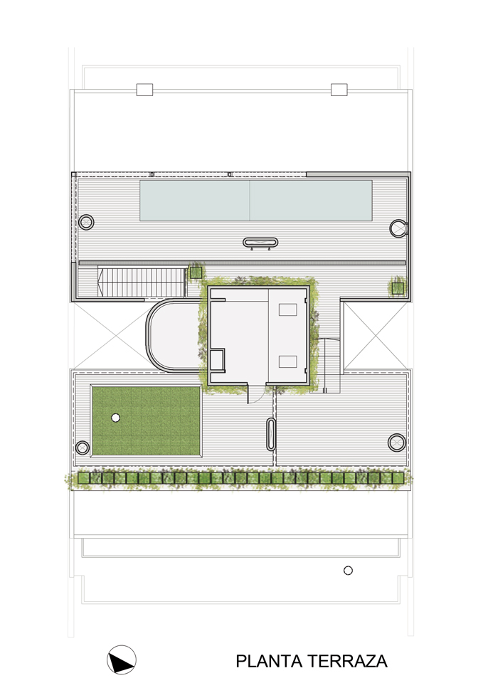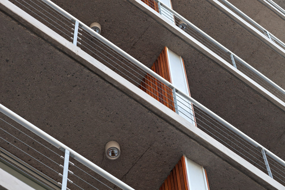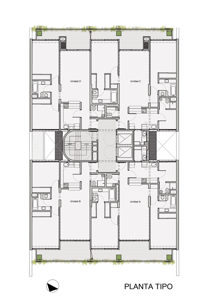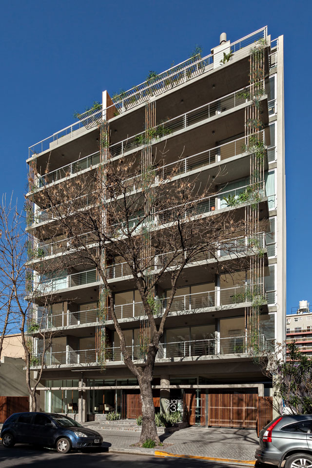 Las siete plantas de viviendas combinan unidades de 2 dormitorios con y sin dependencias. En las expansiones, un conjunto de parasoles verticales materializados con delgadas lamas de madera y las barandas con tensores de acero conforman una membrada cultivada con enredaderas trepadoras, que con el tiempo, cubrirán parte de las fachadas. Este tamiz a la vez de proteger al edificio de la incidencia solar directa, genera un jardín vertical que enriquece las expansiones y las convierten en espacios de transición entre el exterior y el interior de las viviendas. Así el edificio queda atrapado entre dos naturalezas.