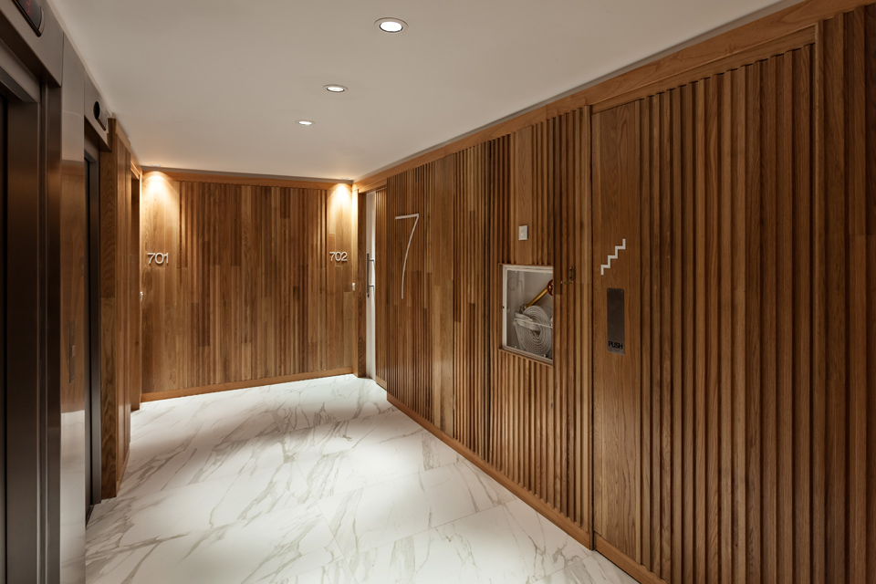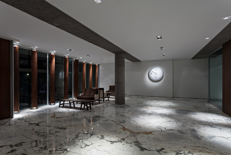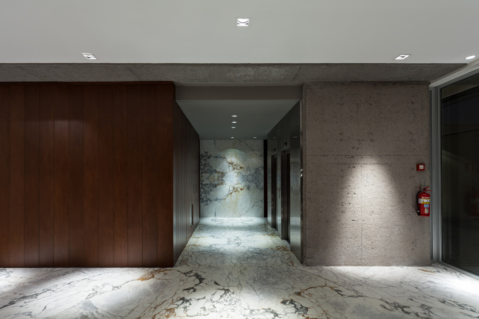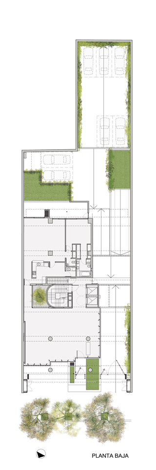 Un basamento de altura importante contiene el hall de entrada, una caja de cristal provista con lamas de madera que regula la relación visual con la calle. Un primer filtro lo conforma un cerramiento de cristal y delgadas lamas de madera, enmarcada por un arco de hormigón martelinado. Este actúa de diafragma entre el ámbito público y el universo privado y recupera por su altura, la escala humana. El sector posterior de la planta baja es destinado a cocheras. El resto de las mismas se alojan en el subsuelo conjuntamente con las salas de maquinas.