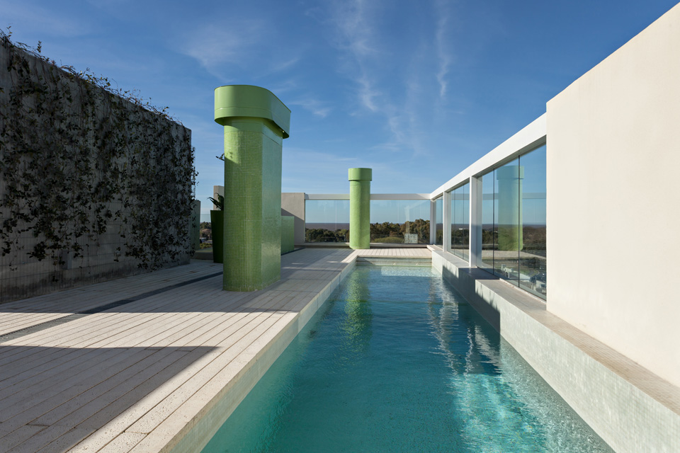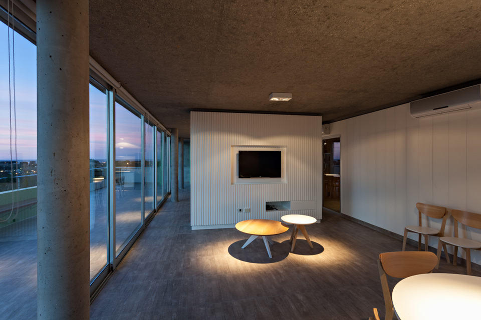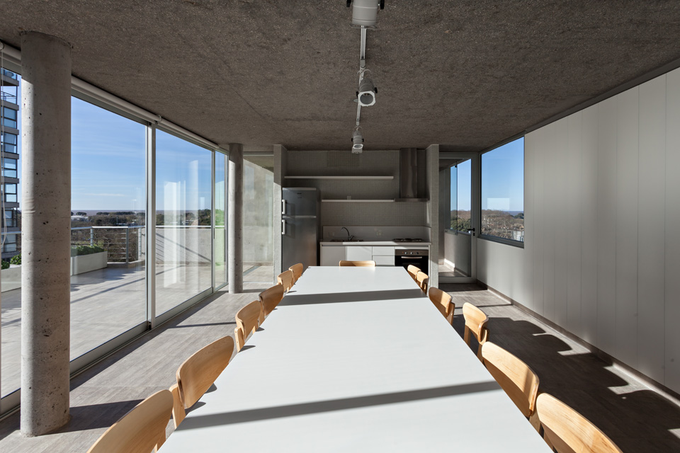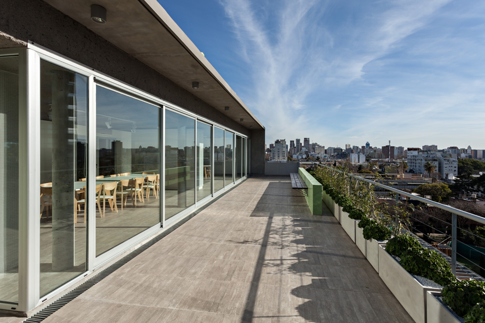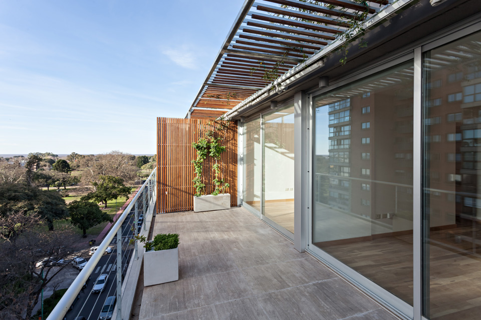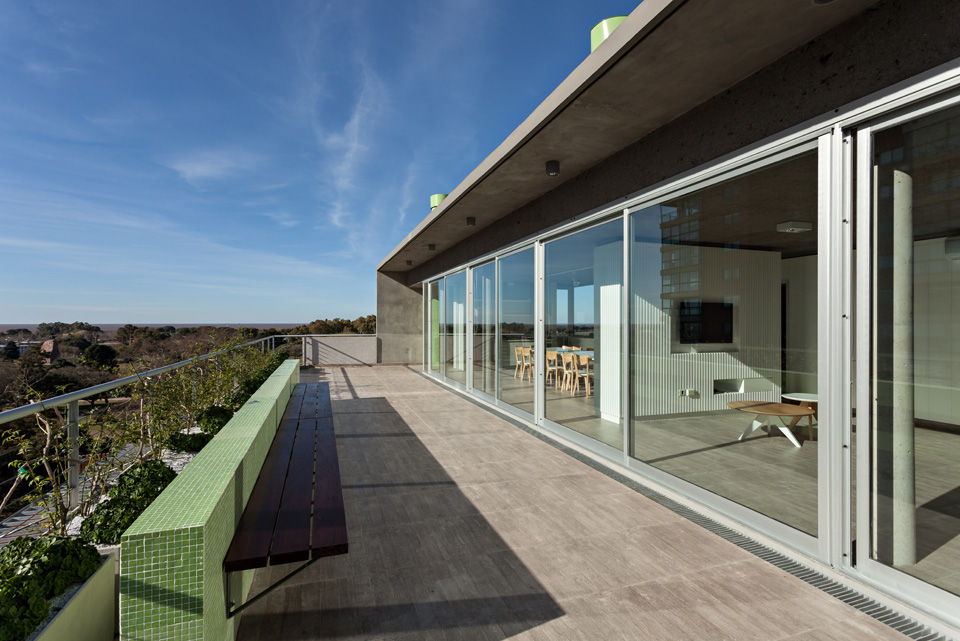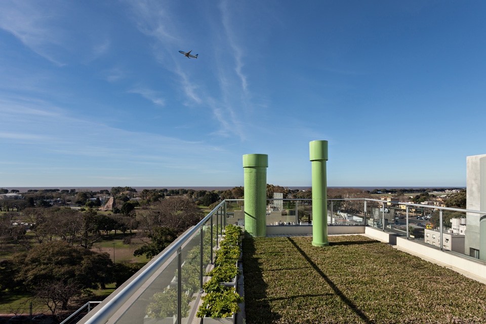 El octavo piso esta recedido en ambos frentes y aloja el salón de usos múltiples, parrilla, gimnasio y amplias terrazas. Todas las cubiertas que rematan el edificio son accesibles, con tierra y césped sobre el SUM y con la piscina y solárium sobre el gimnasio. Las cubiertas devienen miradores al río, al Parque 3 de Febrero y a la ciudad.