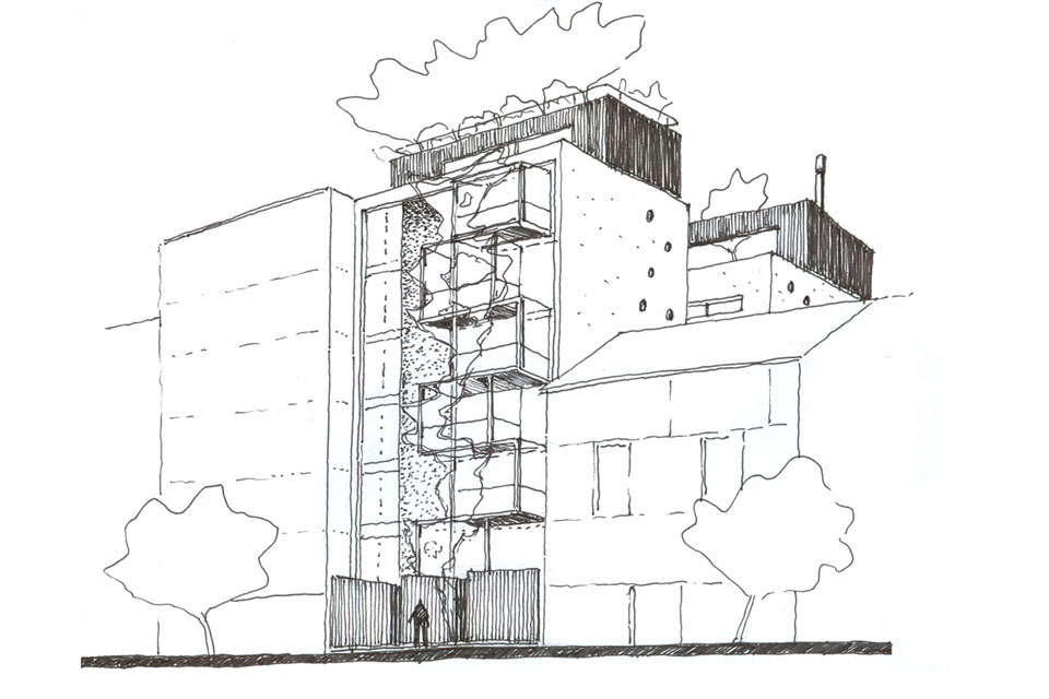 Una propuesta para un lote entre medianeras que tiene la voluntad de aportar cierto grado de diversidad, de quebrar la uniformidad de este tipo de edificios en la ciudad.