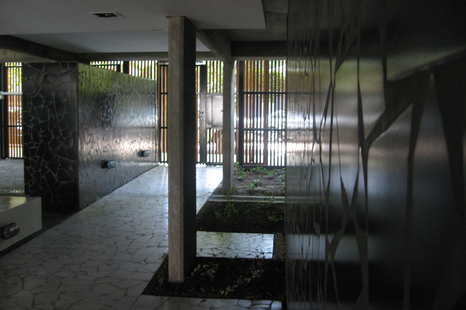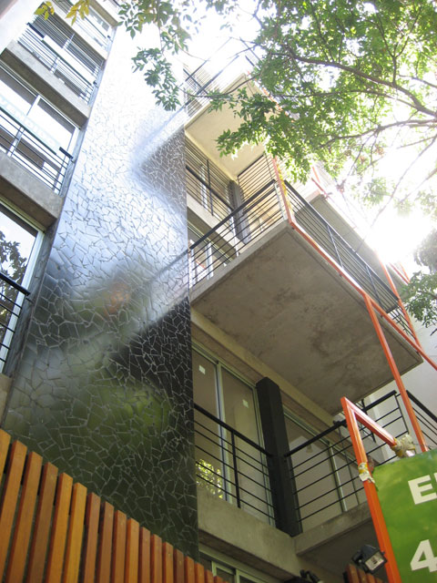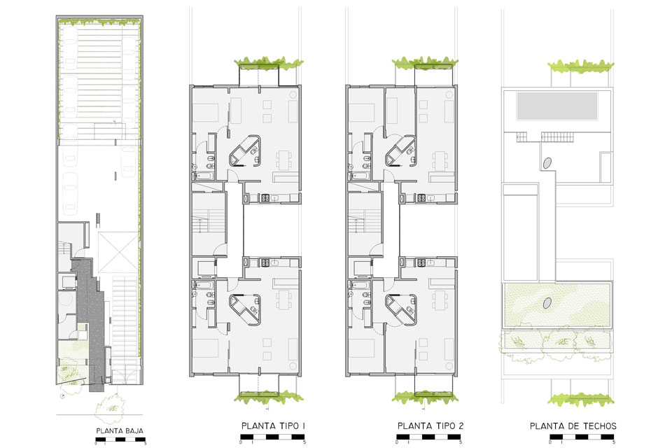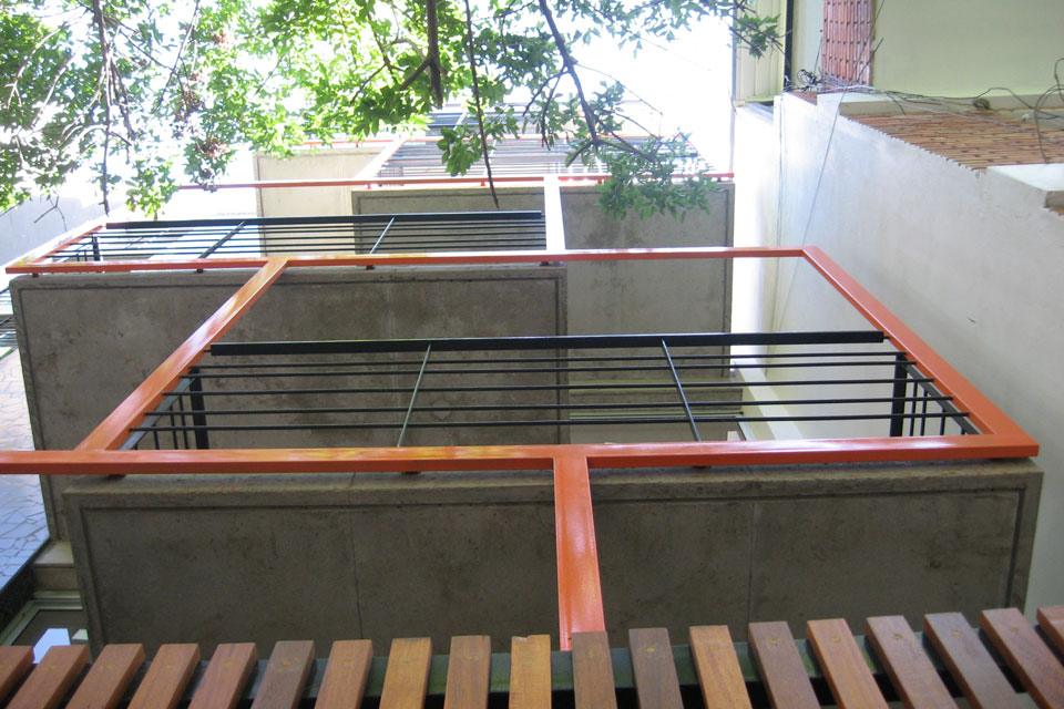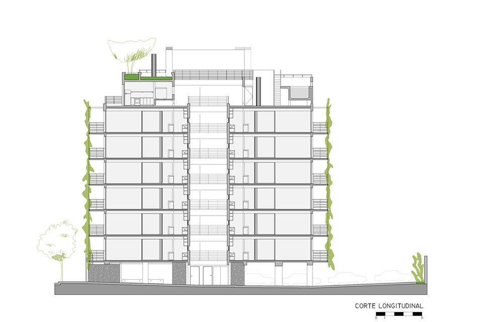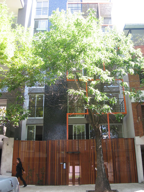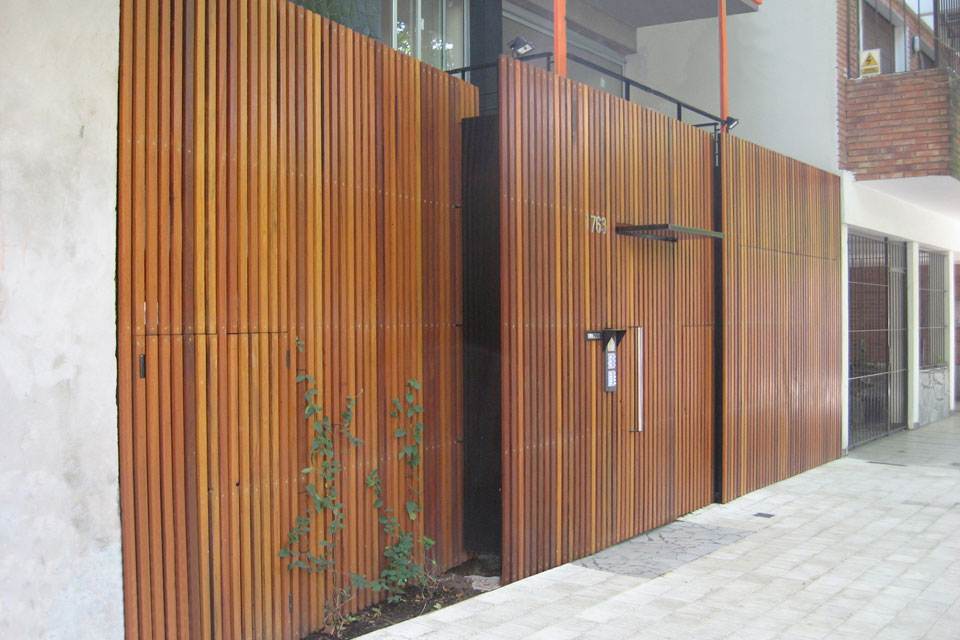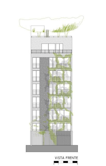 Los balcones se alternan unos con otros, quedando sectores en doble altura, además de estar articulados con una estructura metálica que dramatiza esta operación proyectual. En la planta baja la estructura vacía de los balcones se convierte en “cerco” revestido con maderas, para proteger la privacidad del edificio, al mismo tiempo de permitir una permeabilidad controlada. Los tres rectángulos “cercos” que separan de la vereda están dispuestos en forma libre como los cercos típicos de obra, que durante todo el tiempo protegieron la construcción. En las rajas formadas entre estos planos crecen las enredaderas que trepan por la estructura de los balcones formando un frente vegetal.