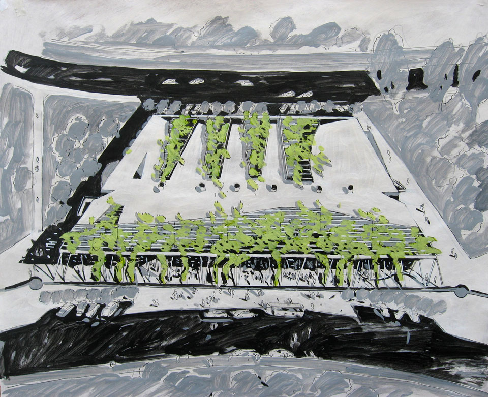 El edificio de baja altura, se desarrolla en dos plantas, con una fuerte relación con la tierra, minimizando los desplazamientos verticales y así los esfuerzo de mecanización, con la respectiva economía de recursos.