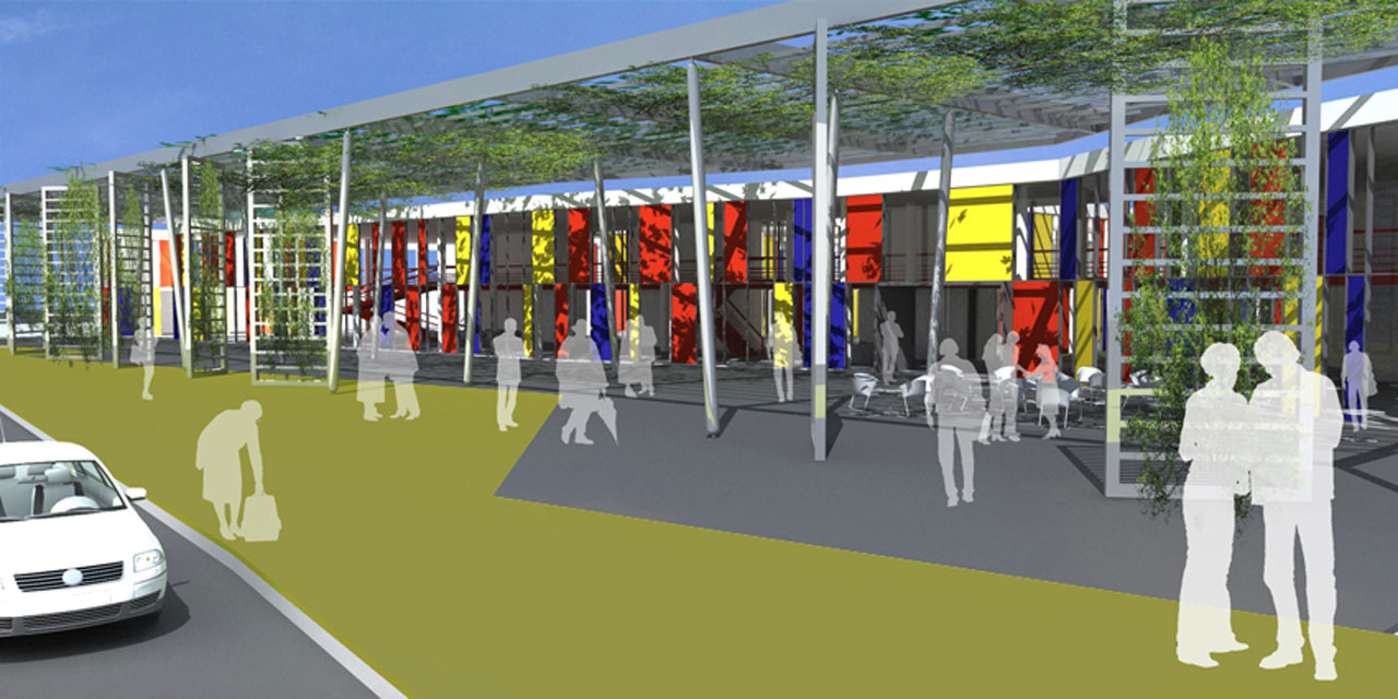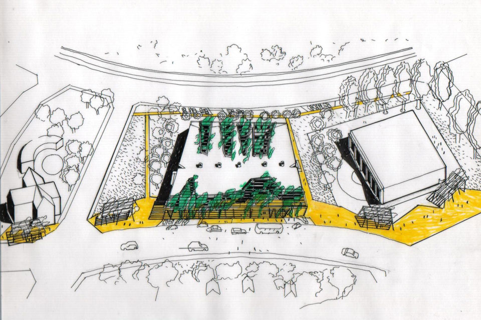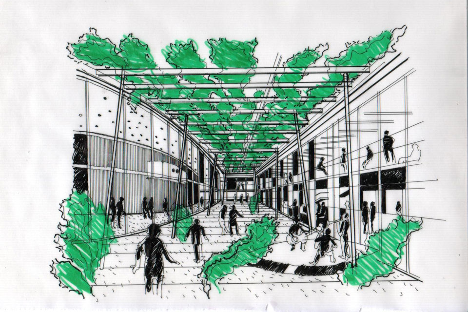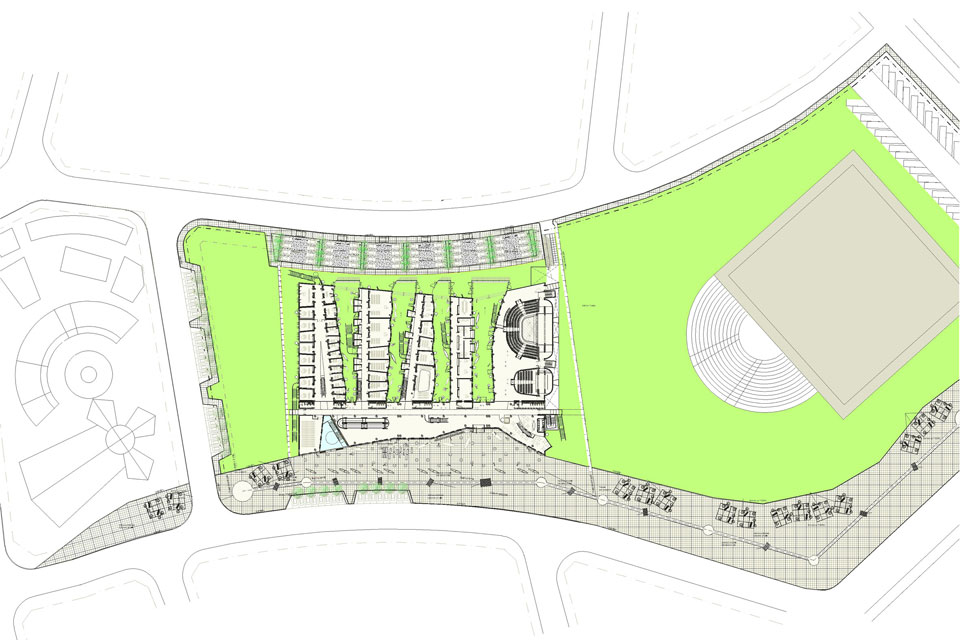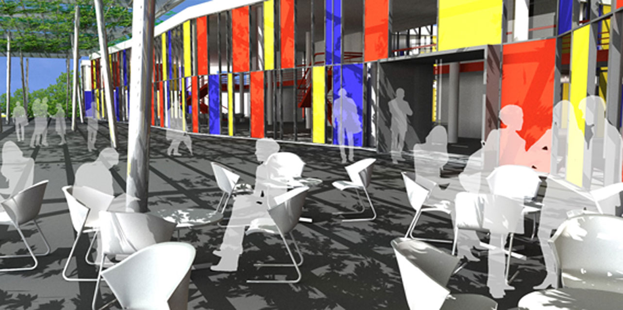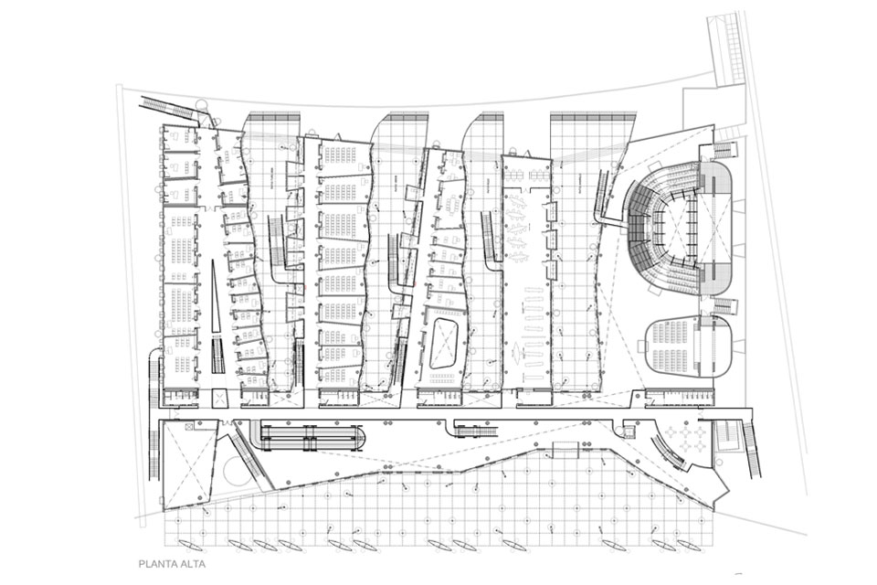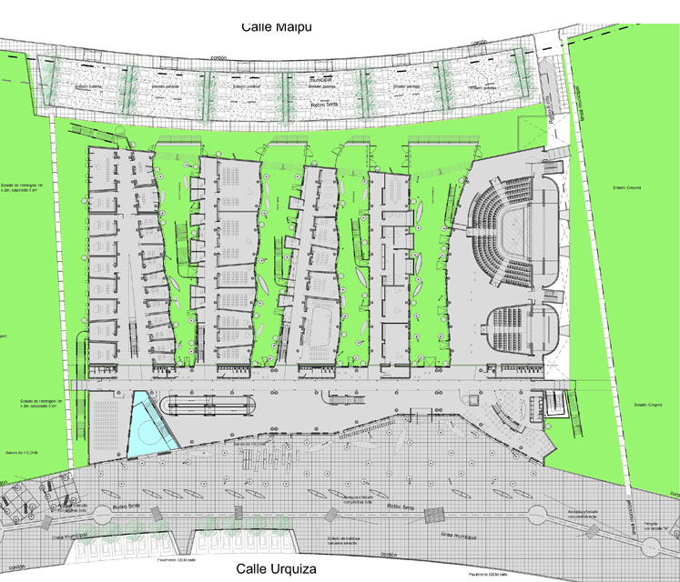 La Gran galería cultivada es transición entre el espacio urbano ¨Rambla de la Música¨ y el Complejo Artístico Cultural; deviene antesala del nuevo edificio, además de ser expansión del bar y convocar expresiones musicales exteriores.