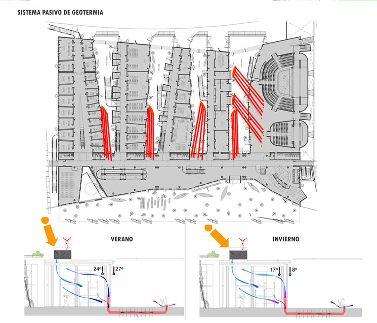 El sistema de acondicionamiento natural del aire interior a partir de la introducción de aire desde el exterior, conducido dentro de cañerías enterradas atempera el fluido en forma natural, sin accionamiento mecánicos, enfriando el aire en verano y calentándolo en invierno; las chimeneas solares practicadas en la cubierta acelera el movimiento ascendente del aire caliente.