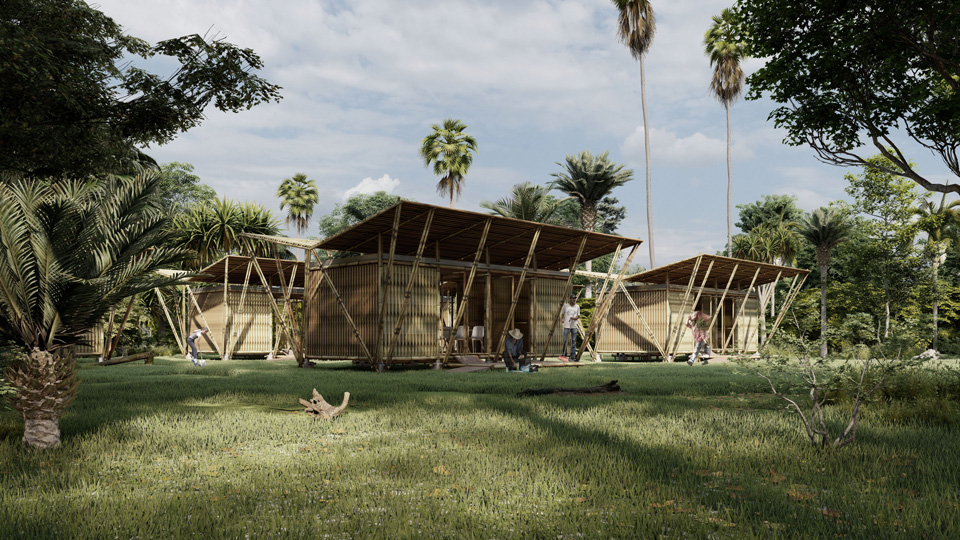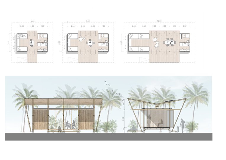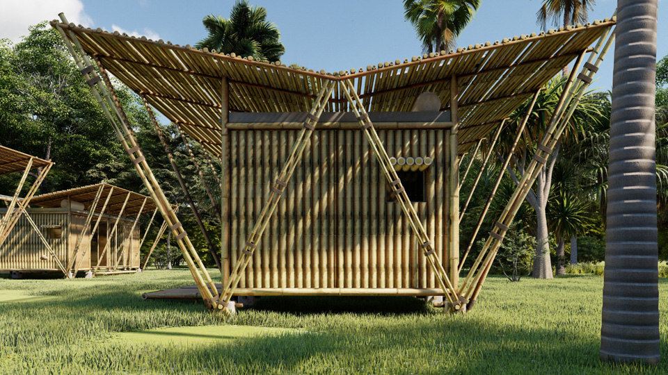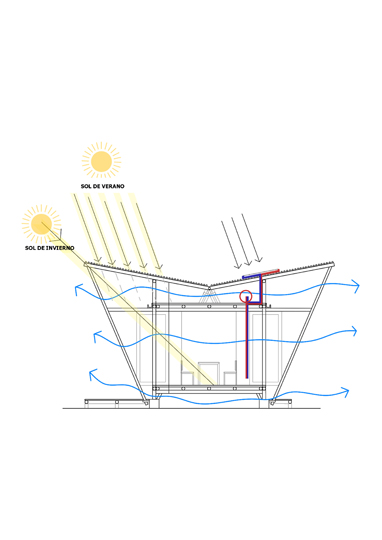 MONTAJE. Se trata de piezas prefabricadas de caña de gran liviandad, fácilmente transportables en camionetas y camiones. Permite el estibaje, montaje y desmontaje ágil. Estructura de muros, cubierta y sobretecho de cañas de 10 cm. de sección; cerramientos de cañas de 5 cm. de sección cortados al medio y articulados unos con otros en posición inversa generando cámaras de aire; pisos de madera y cubierta de chapa plegada U 45. Las aberturas tienen estructura de caña y piezas de policarbonato.