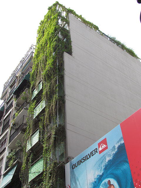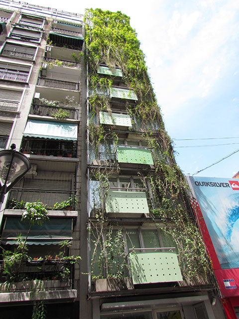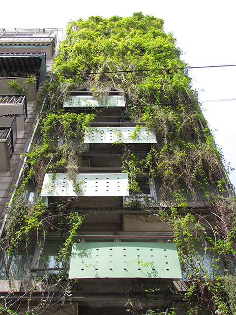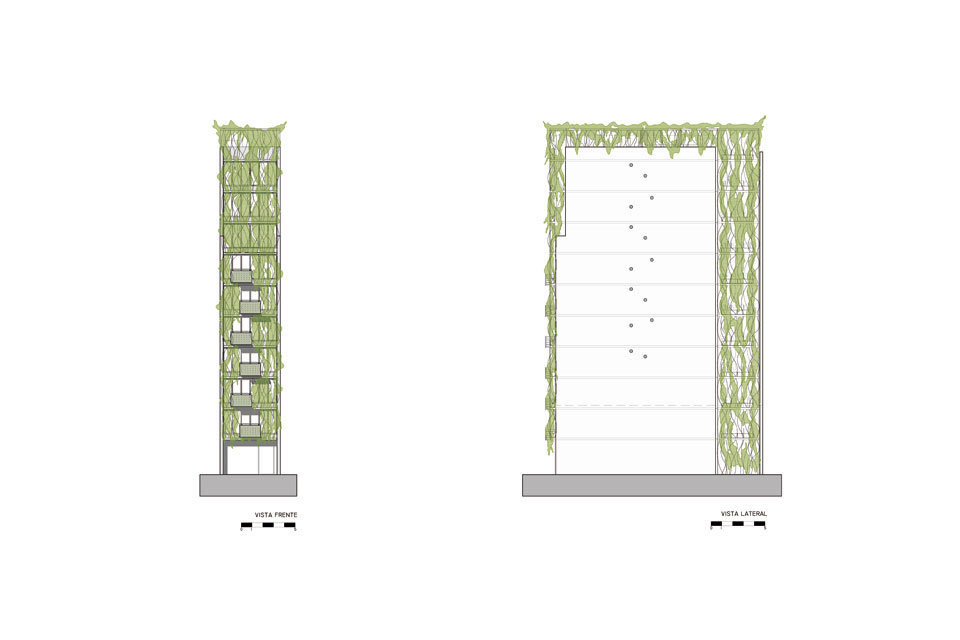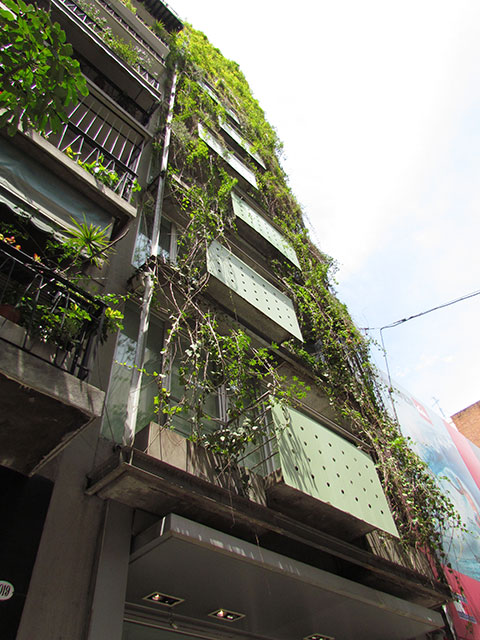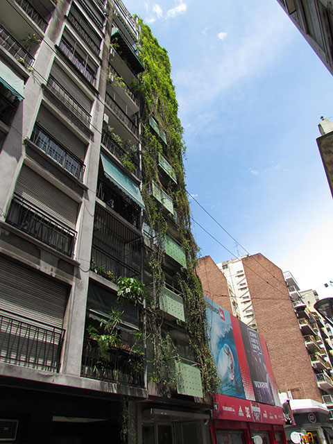 El hotel se encuentra en el microcentro porteño, en un estrecho lote de 5.60metros de frente. En un contexto que ha perdido la cosmicidad del habitar urbano, se concibe un edificio provisto con una segunda piel, pensada como un gran jardín vertical. Esta piel esta cultivada con akebias quinatas que cubren íntegramente el frente, la parte superior de la medianera hacia M. T. de Alvear y la cubierta del hotel, convirtiéndose en una desafiante cuchillada de verde en medio del continuo gris predominante.
