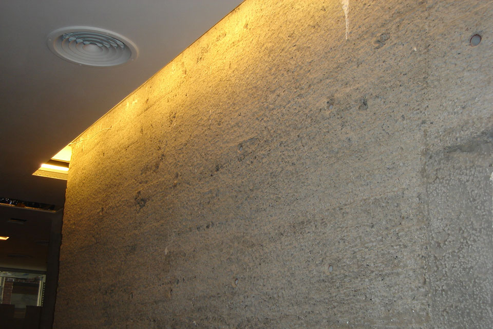 Centralmente ubicada en la planta, el núcleo vertical constituye un volumen de hormigón martelinado, que a manera de piedra artificial se diferencia y contrasta por su rusticidad y textura con el resto de las terminaciones del interior del hotel.