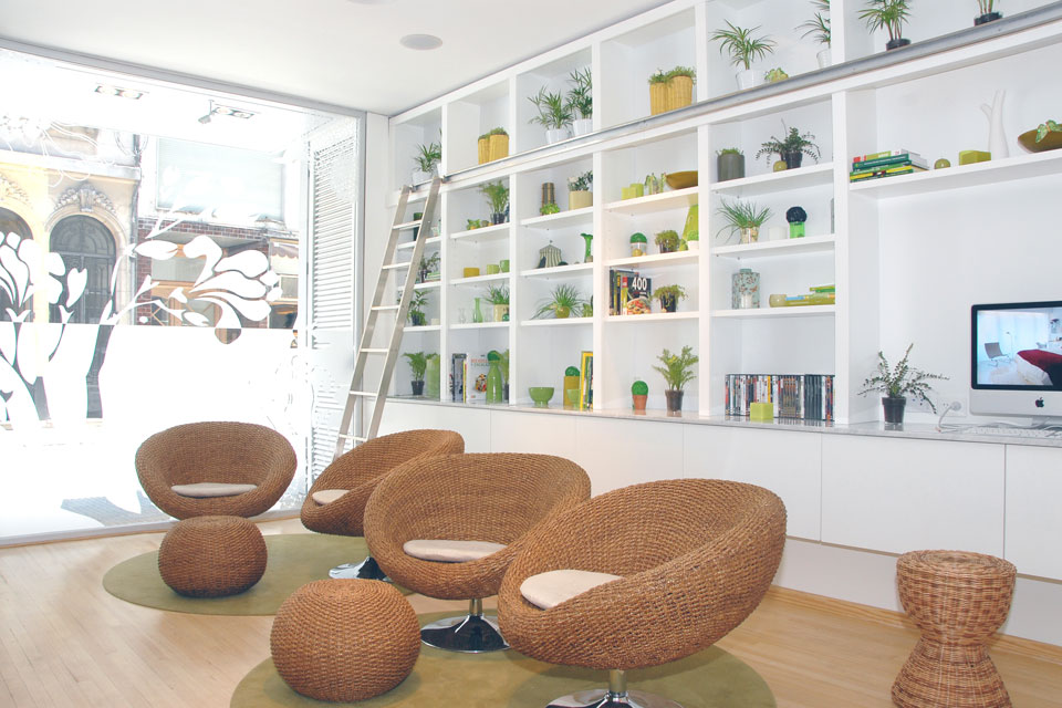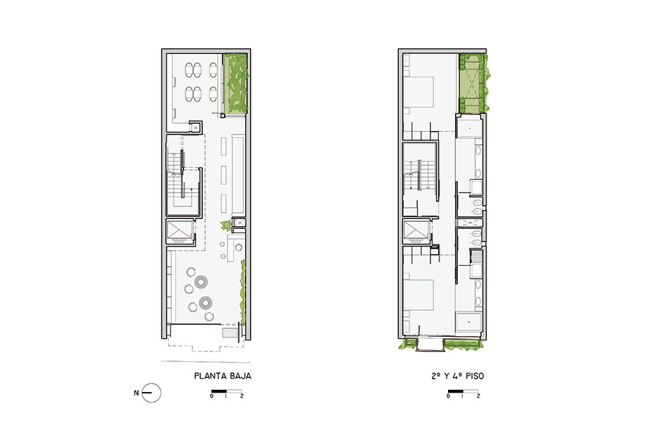 En la planta baja se encuentran la recepción y el bar se ubicado junto al patio posterior, mientras que la sala de estar, en el centro de la planta baja, se despliega en un largo sillón, logrando así que estos ámbitos se acomoden brindando y construyendo espacios de encuentro y reunión.