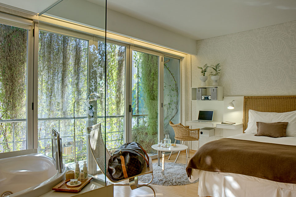 Las plantas de las habitaciones, en cambio, están signadas por la madera que revisten una pared entrelazando las dos habitaciones y el palier. Cada una de las 17 habitaciones se concibió como un spa en si misma, provistas de un piletón interior, un sauna y una ducha especial.