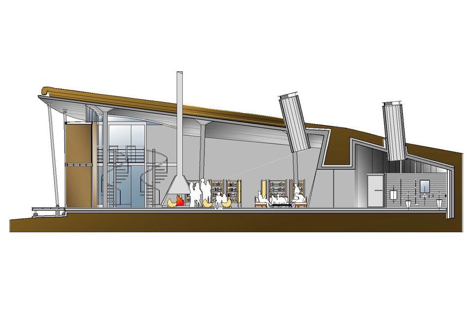 Esta cubierta vegetal se convierte en mirador elevado ofreciendo las mejores vistas panorámicas al lago y a las montañas. Además protege al edificio de los fuertes vientos y las inclemencias del clima.