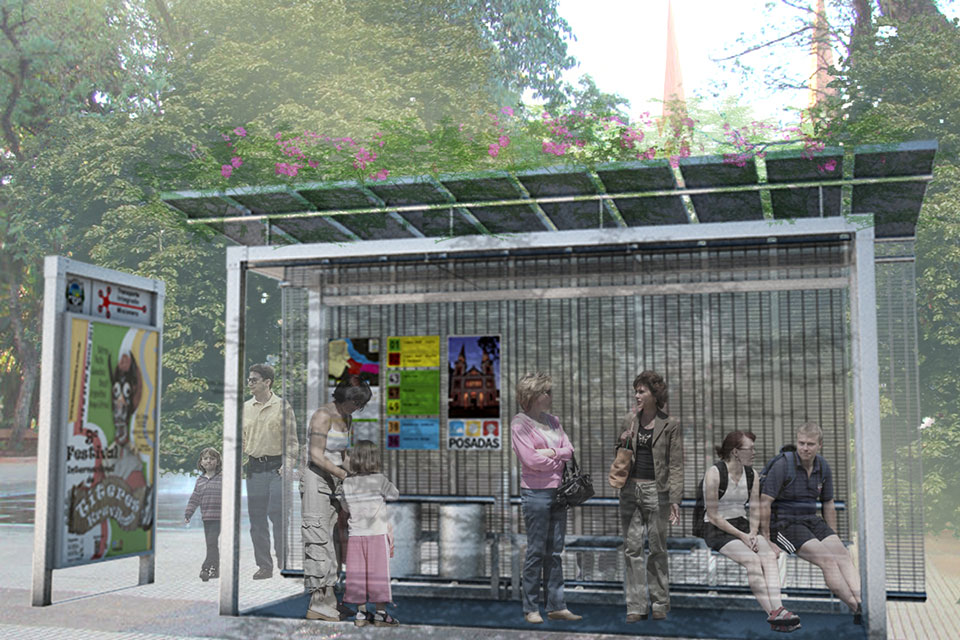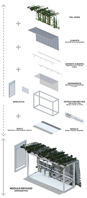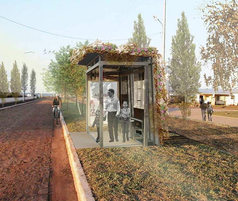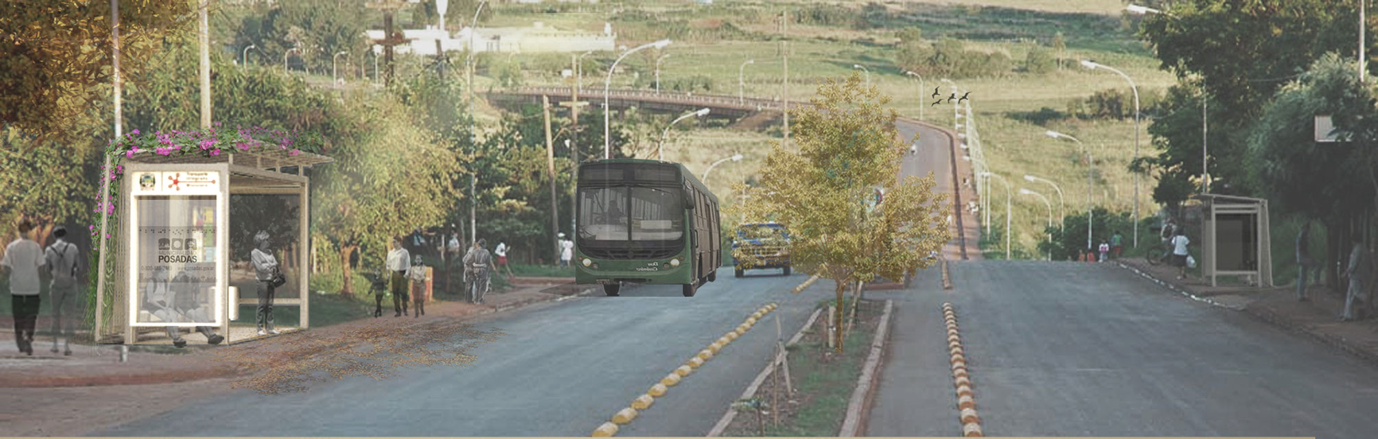 Se propone el mobiliario urbano como un sistema de refugios-pérgola cultivados a la manera de jardines urbanos, que aporten una fuerte identidad regional acorde a un contexto cultural y un clima. Nos propusimos encontrar una respuesta enraizada en el paisaje con la tecnología apropiada. Se trata de humanizar el espacio público de la ciudad, transformando positivamente la movilidad urbana y caracterizando su desarrollo turístico. Las estructuras son portadoras de vegetación autóctona, dadoras de color, perfume, sombra y una atmósfera de encantamiento del paisaje urbano y rural. Convertir en positivo el tiempo de las esperas para el disfrute de todos, lugares para la vida protegidos de la fuerte incidencia del sol misionero. Los espacios propuestos que se convertirán en parte de la vida cotidiana de la comunidad, estimulan la experiencia sensorial, acusan el paso de las estaciones con las distintas floraciones y acrecientan la cosmicidad del habitar urbano.
