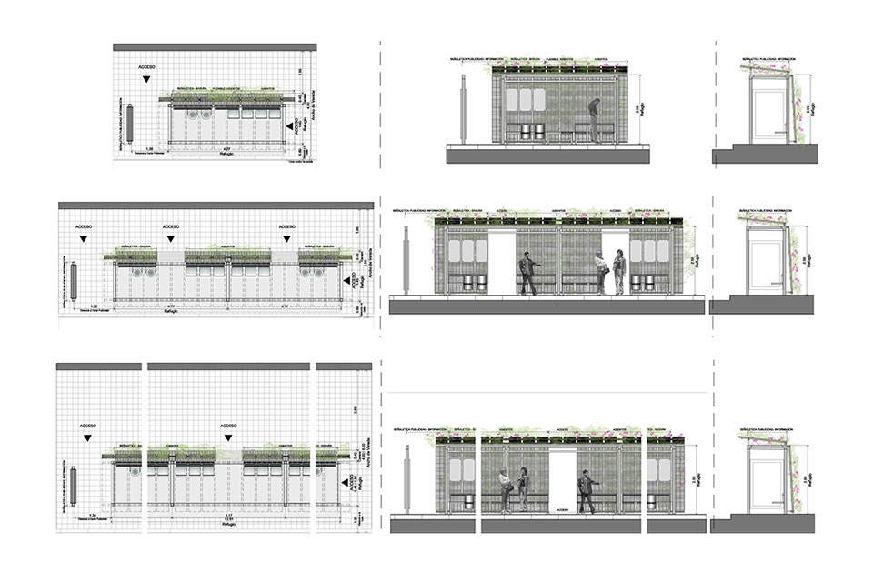 El sistema proyectado a partir de la repetición modular permite resolver los distintos requerimientos según la distinta densidad de usos correspondiente a las áreas históricas, turísticas, autovías, barrios y áreas rurales, con el sencillo acople de dos o más módulos. También es flexible la articulación de los distintos componentes que permite múltiples variaciones de acceso a los refugios, cantidad de asientos, ubicación de paneles de señalética, etc.
