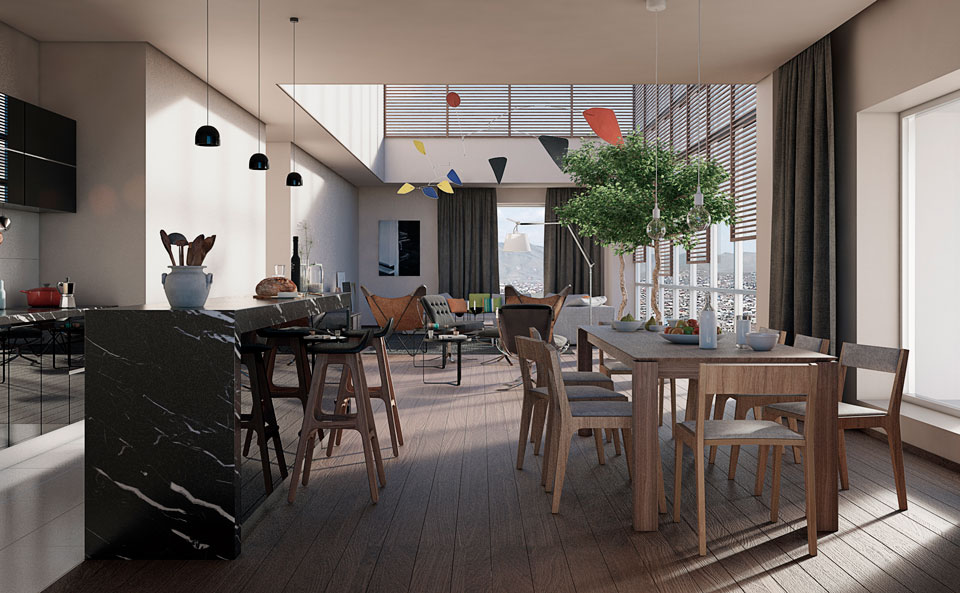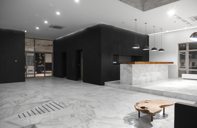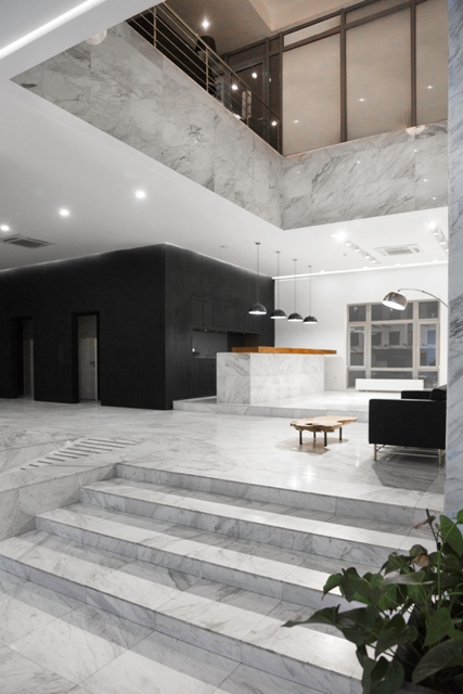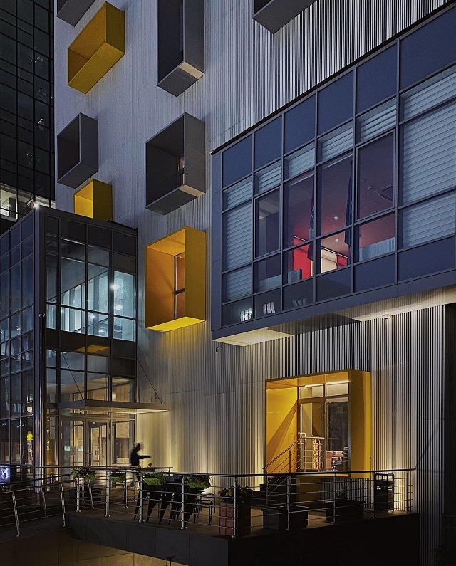 El sólido volumen de la torre es intervenido con cajas acristaladas tanto en las plantas públicas, como en el remate del edificio. Estos prismas transparentes contienen el hall de entrada en doble altura, las oficinas del primer piso; en el remate del edificio alojan la sala de estar y el espacio del spa del penthouse, oficiando de miradores al paisaje de la ciudad y las montañas que la rodean.