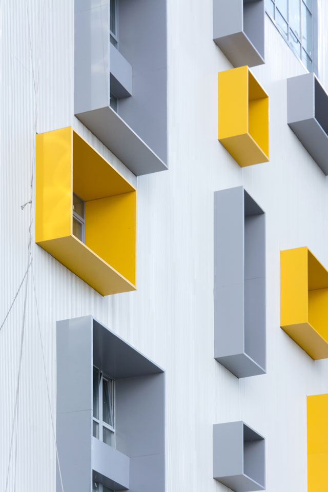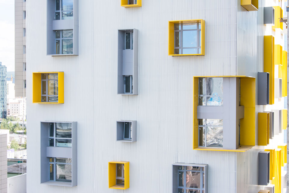 Ante la proliferación de una arquitectura internacional de edificios totalmente acristalados, tanto aquí como en cualquier parte del mundo, poco adaptados al clima y a los paisajes locales, se propone otra arquitectura. Se concibe una propuesta sustentable con la incorporación de ideas de diseño que apunten a la sabiduría de soluciones más que al uso de tecnologías caras. Emprendimos la búsqueda de una materialidad apropiada con economía de recursos, inspirada en el estudio de las yurtas, viviendas vernáculas mongolas. Esta arquitectura popular consiste en tiendas de planta circular, construidas por los pobladores nómadas de las estepas, compuestas por múltiples capas aislantes con una sola abertura ubicada hacia el sur, la mejor orientación en el hemisferio norte. En la Torre Blanca se emplearon anchos muros de múltiples capas constructivas que envuelven y protegen al edificio de las bajas temperaturas que llegan a -45º en los crudos inviernos. Las aberturas intervienen esa potente envolvente protectora, sin quitarle el predominio de la masa. Una serie de livianas cajas de cristal emergen del volumen del edificio, contrastando con la potente masa muraria que, al caer el sol, se convierten en múltiples linternas. Las ventanas horadan la masa construida que, con sus emergentes marcos de color, contrastan con la blanca epidermis de fondo. Esta composición humaniza la escala de la torre y le aporta singularidad e identidad en un anodino entorno de torres de courtain wall. Desde el interior, las aberturas se convierten en verdaderos enmarques al paisaje urbano y a las montañas circundantes.