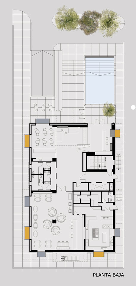 En un contexto de escasos espacios públicos, con edificios que no generan situaciones de apropiación en el nivel de las aceras, se propone una planta baja abierta a la ciudad. El edificio se retira y origina una pequeña plaza pública con una fuente-escalinata. Este nuevo espacio público con el edificio como telón de fondo se ha convertido en un lugar de encuentro colectivo, como espacio de manifestaciones artísticas, recitales de música, acrobacia, desfiles de moda y la fuente es tomada en verano por los chicos para chapotear y refrescarse. Se podría decir que el edificio le pertenece a la ciudad y es parte de su identidad.