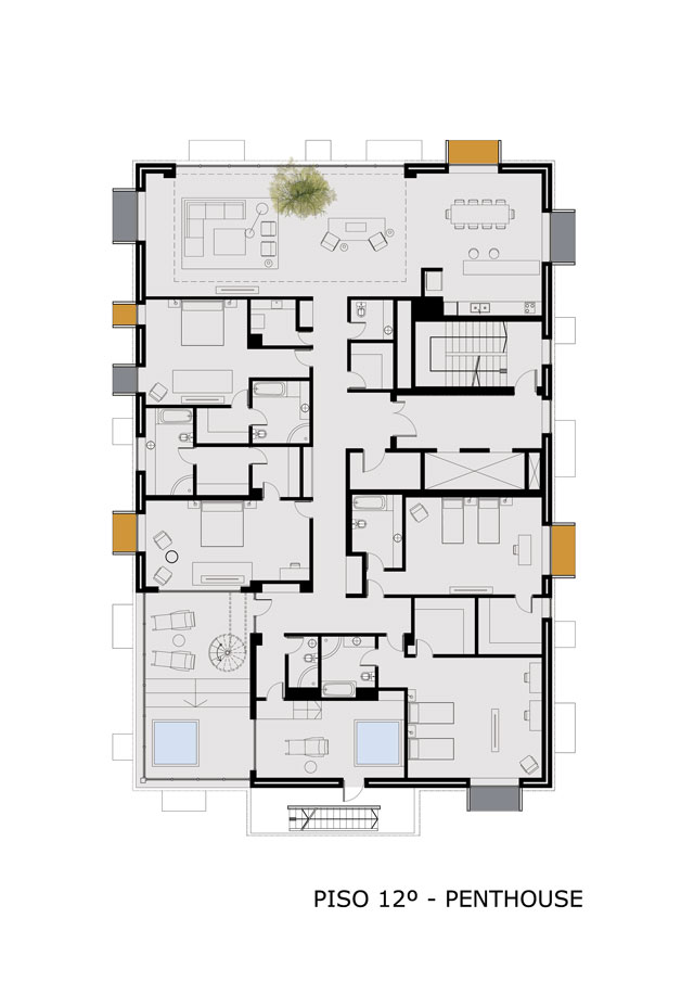 En el interior de la torre se ubican programas híbridos convocantes de distintos tipos usuarios. La planta baja aloja un bar con su expansión hacia el espacio público, un restaurante y una galería de arte contemporáneo, programas convocantes de diferentes públicos. En el primer piso se encuentra un conjunto de oficinas ocupadas por la Embajada de Austria y un kindergarten para asistir a los trabadores y a los residentes del edificio. En el resto de los niveles hay residencias y en el remate superior un penthouse que corona el edificio.