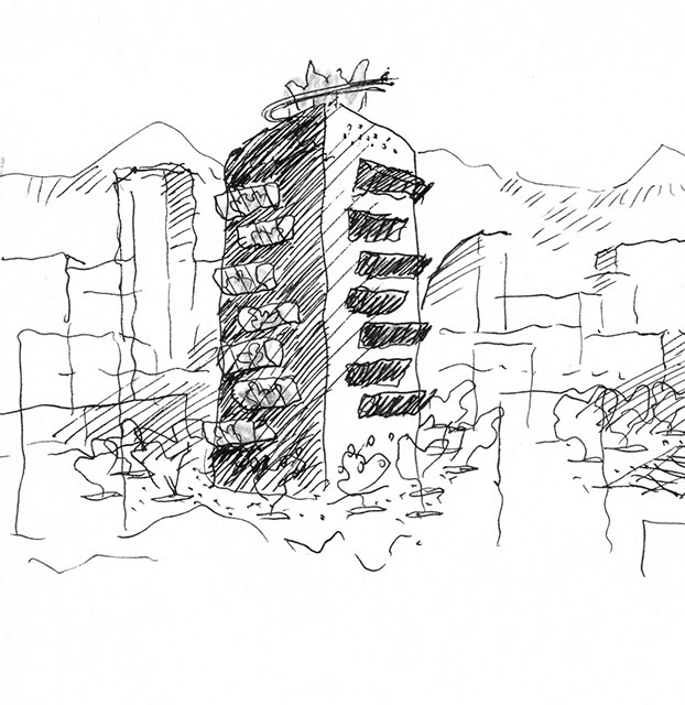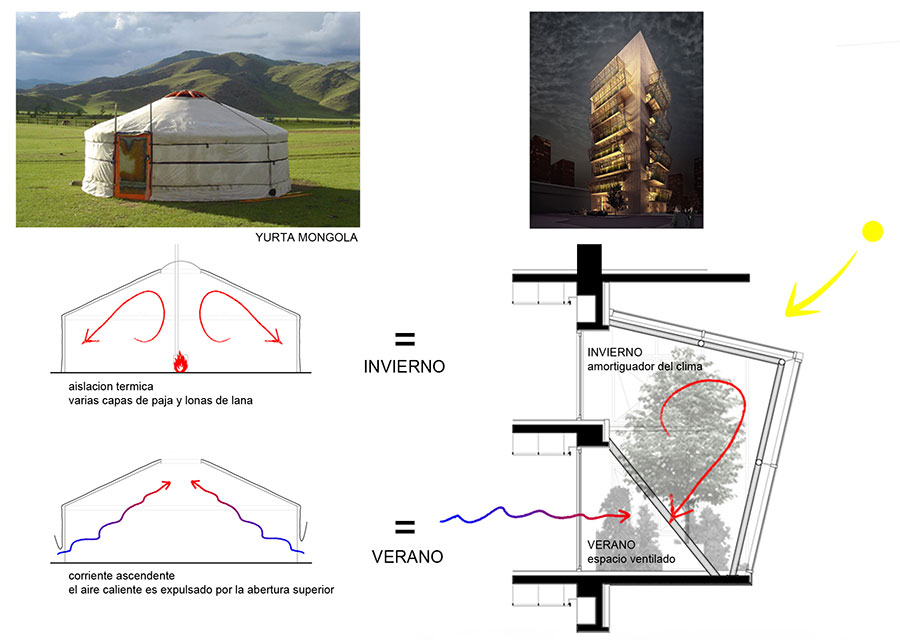 Ante la proliferación de una arquitectura internacional de edificios igualmente acristalados en cualquier parte del mundo, poco adaptados al clima y a los paisajes locales, se propone otra arquitectura. La concepción de dos torres “vernáculas”, en búsqueda de una materialidad apropiada, con economía de recursos, que recupere la sabiduría de las gers, viviendas tradicionales mongolas.
