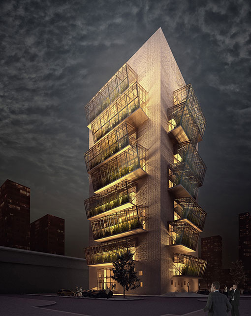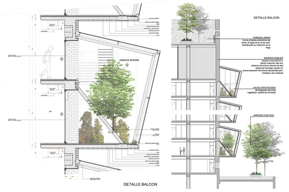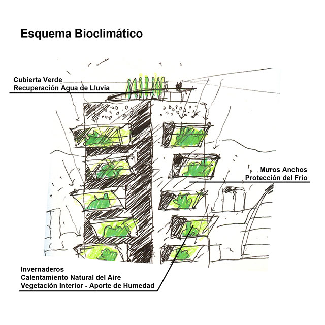 Se proponen anchos muros de ladrillo de máquina que envuelven y protegen a los edificios de las bajas temperaturas que llegan a -45º en los crudos inviernos. Los dos potentes volúmenes ladrilleros son intervenidos por cajas acristaladas que emergen en atrevidos voladizos. Estos invernaderos tienen doble piel, una exterior con triple vidriado hermético y otra interior también acristalada. Actúan de fuelle amortiguador de las hostiles temperaturas y en verano son espacios ventilados. En su interior contienen jardines en altura, humectando el seco ambiente de la desértica estepa, donde fue construida la ciudad. Se trata de una arquitectura de transiciones, donde el límite entre el exterior y el interior tiene espesor y es allí donde se alojan los espacios más interesantes que aportan singularidad al conjunto.
