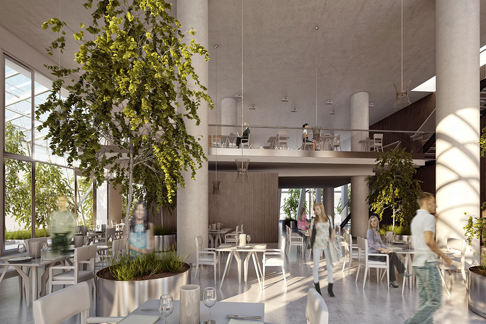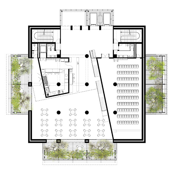En el último nivel del edificio de oficinas se alojan un auditorio y un restaurante con acceso a la terraza-jardín. En la cubierta verde remata el edificio un rampa helicoidal que se convierte en un mirador a la ciudad y a las montañas circundantes.