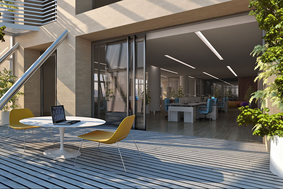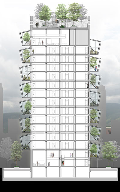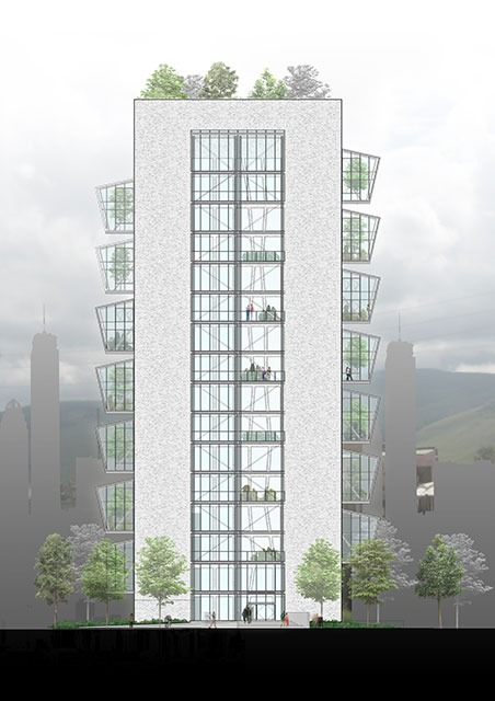 En una región donde no existen jardines, ni parques, donde los espacios públicos carecen de vegetación, se proponen jardines como mochilas que emergen de las torres, generando espacios de esparcimiento y recreo, al mismo tiempo que reinventan el hostil paisaje urbano. En la fachada norte del edificio de oficinas, se alojan los ascensores panorámicos y unas terrazas en doble altura usadas como expansiones en los días cálidos de verano. En el hotel las cajas acristaladas del remate del edificio alojan el restaurante y la piscina.