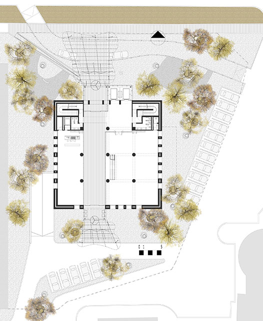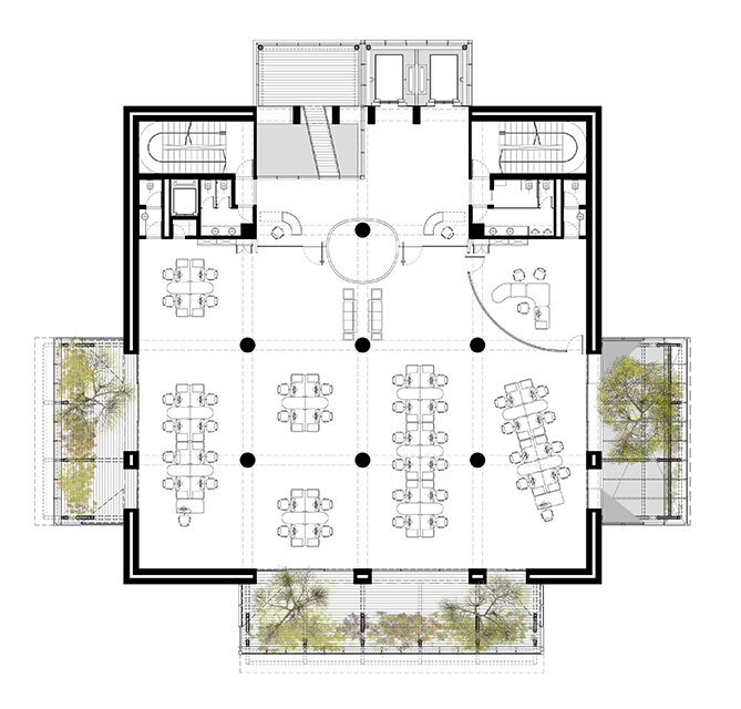 Es un contexto con pocos espacios públicos, donde los edificios no generan situaciones de apropiación en el nivel de las aceras, ambos edificios proponen plantas bajas con jardines públicos, abiertos a las calles. En el interior se alojan programas híbridos convocantes a distintos tipos usuarios. En el edificio de oficinas un banco y un bar literario se articulan a partir de una calle interior de doble acceso que se convierte en una galería de arte. En el hotel, el lobby se complementa con un café y un salón de eventos.