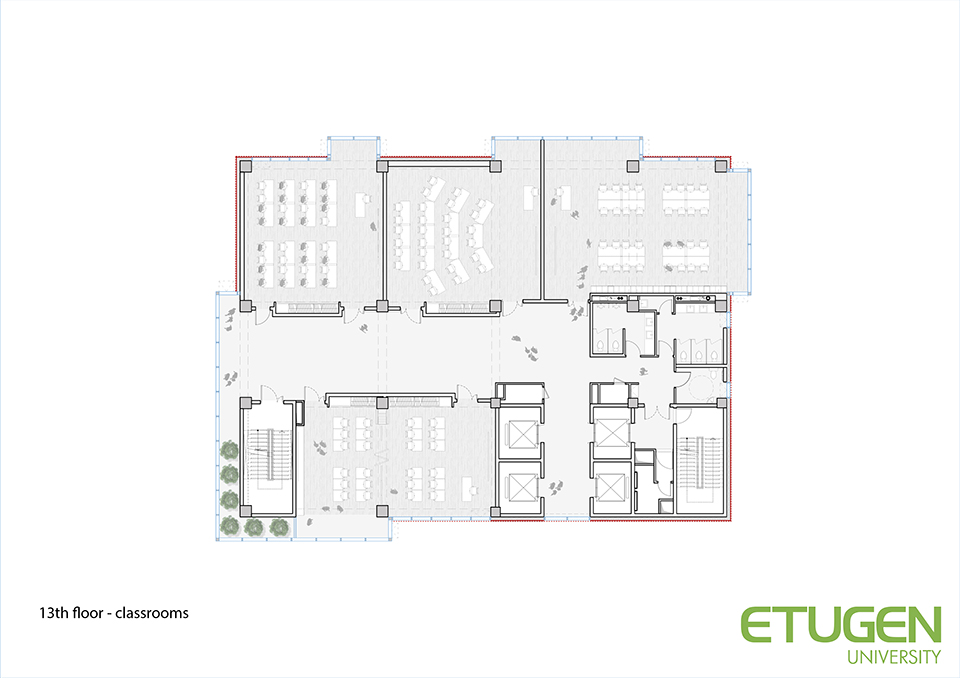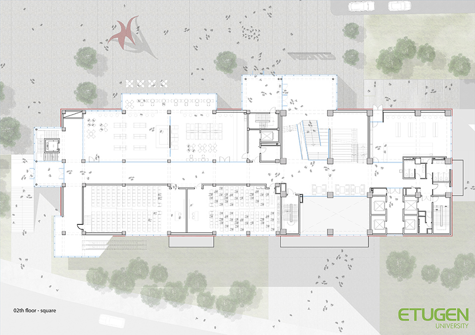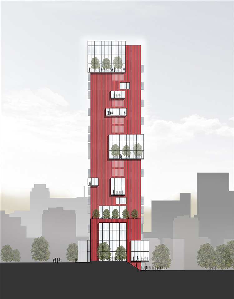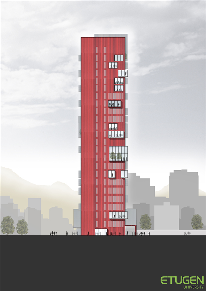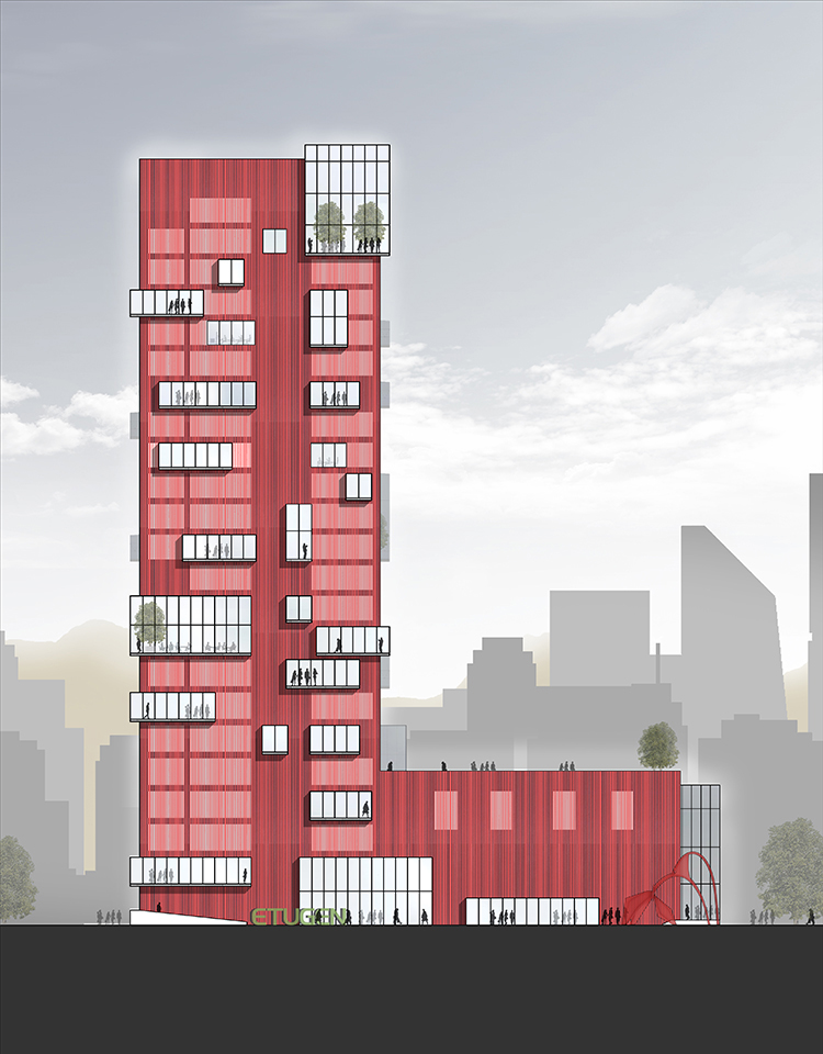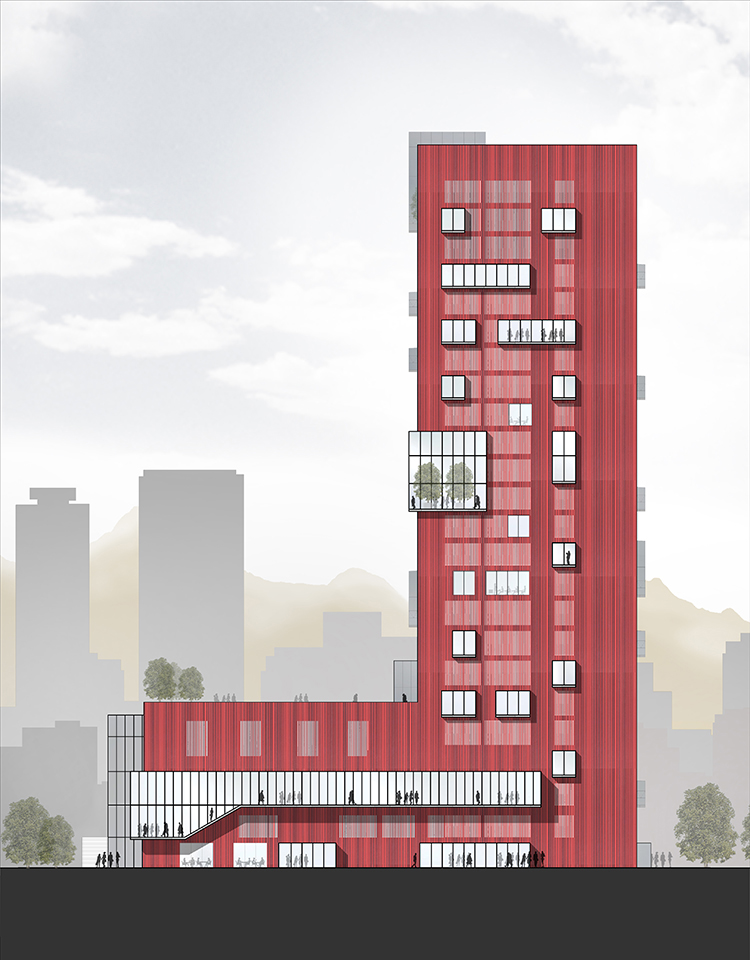 Ante este panorama se propone una torre con una singular silueta en forma de L y de un llamativo color rojo que hace que se identifique en el contexto. El importante basamento del edificio actúa de telón de fondo a una nueva plaza pública propuesta para articular el conjunto de los edificios universitarios. Al mismo tiempo este cuerpo de proporciones horizontales y de menor altura, genera una contención del espacio urbano de la calle. La proporción de la plaza y la torre recuerda (en su vocación de generar un recinto urbano) las “piazzettas” de los pueblos medievales en colina de la Toscana italiana.