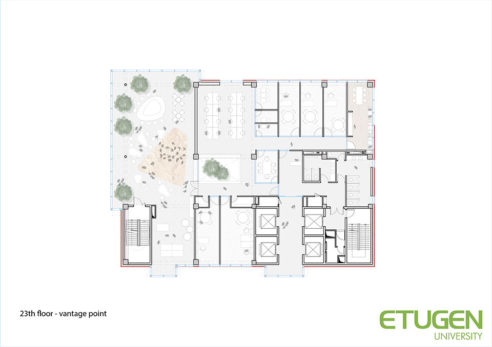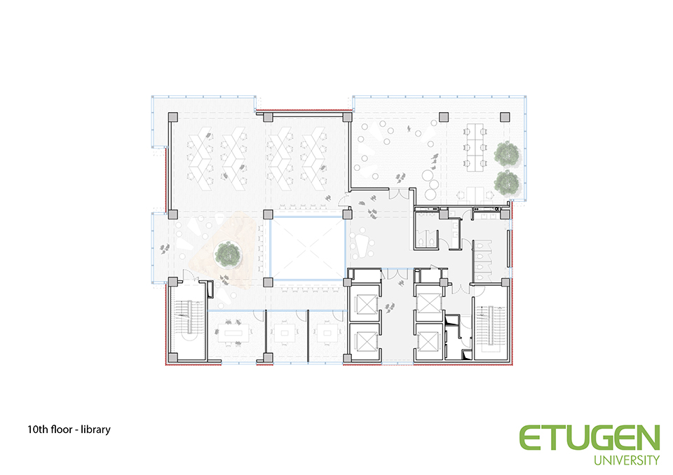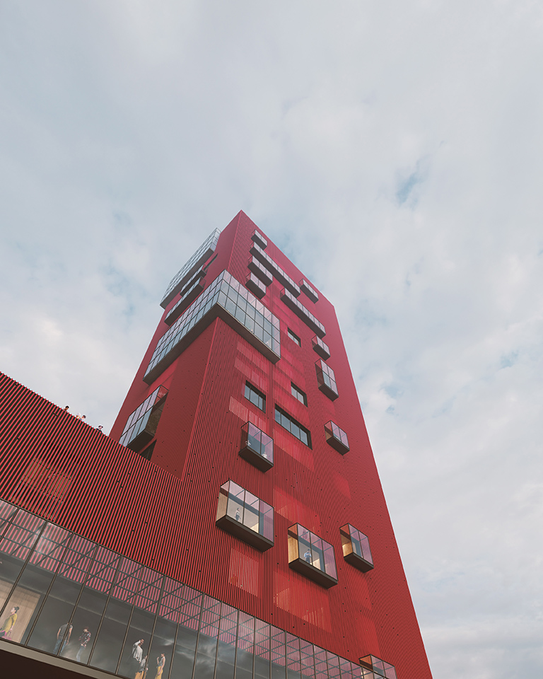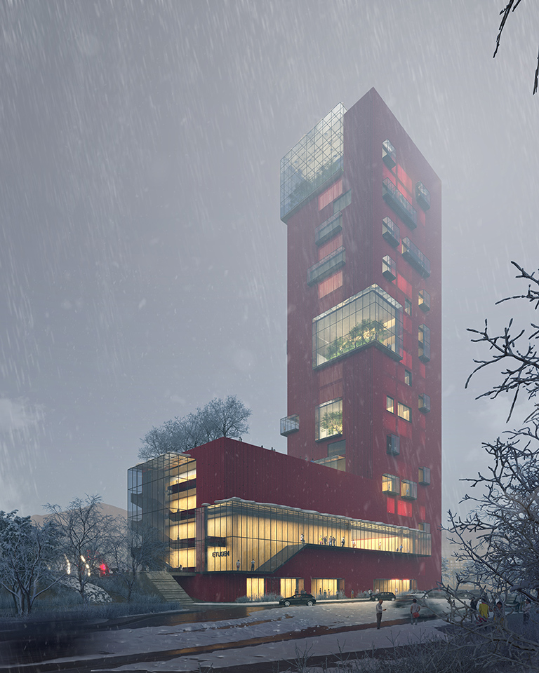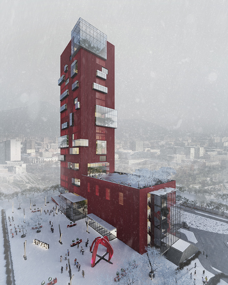 Contrastantes con la potente masa muraria, múltiples linternas constituidas por livianas cajas de cristal emergen del volumen rojo. Estos componentes alojan los accesos en la planta baja y en los niveles superiores aportan espacios de distensión y relax con la generación de miradores con las mejores vistas a la ciudad y a las montañas circundantes. En el remate de la torre, un gran espacio acristalado de triple altura se convierte un lugar de encuentro de la comunidad de profesores y estudiantes.