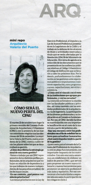 Mini Reportaje a Valeria con motivo de su designación como Presidenta del CPAU -Consejo Profesional de Arquitectura y Urbanismo_ en el suplemento del diario Arq Clarín....