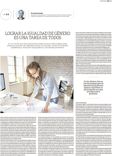 Nota de Horacio en Clarin Arq Enero 2021 Es un hecho que las arquitectas todavía tienen dificultades para alcanzar puestos de liderazgo tanto en estudios como en ámbitos académicos. Alcanzar la equidad es una deuda pendiente....